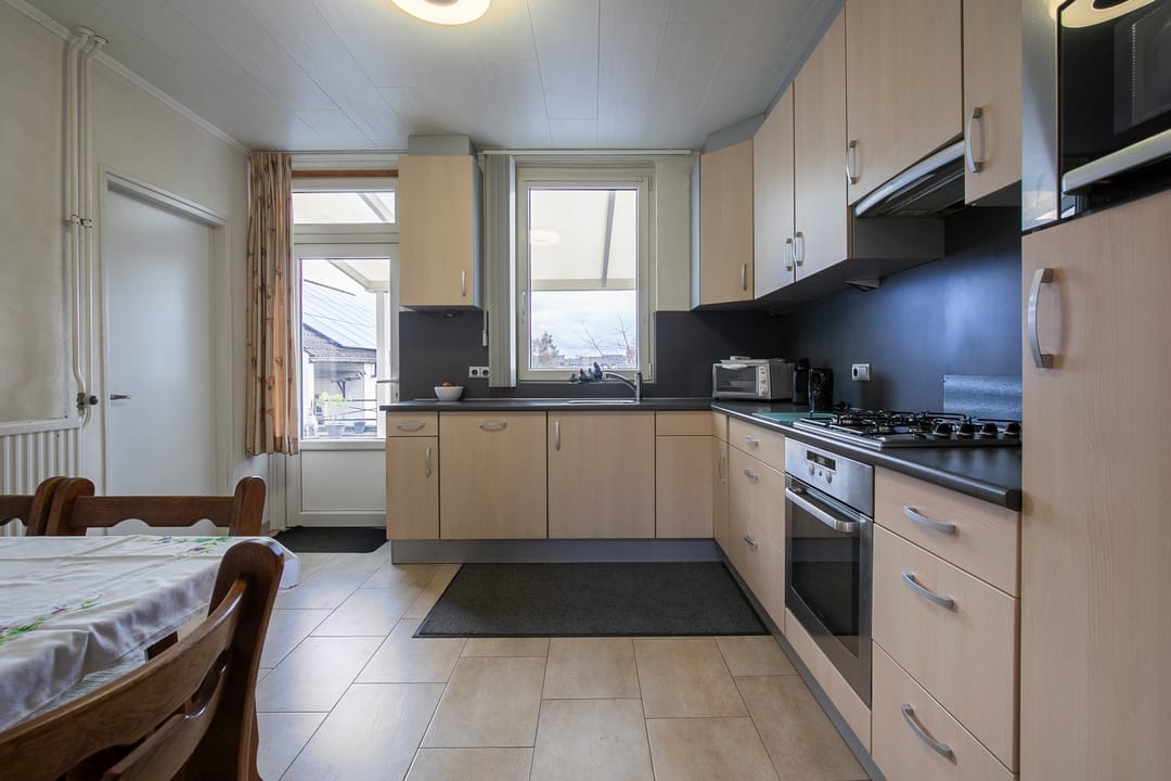 De halfopen keuken is uitgerust met een hoekopstelling en beschikt over een inductiekookplaat, afzuigkap, oven, vaatwasser, koelkast, 1,5 spoelbak en diverse kastruimte. Aansluitend bevindt zich een portaal met toegang tot de achtertuin en de bijkeuken.