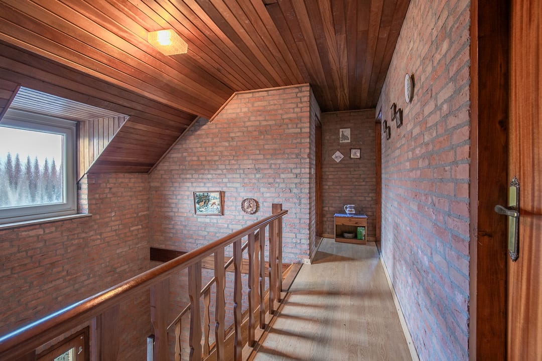 Overloop met toegang tot drie zeer ruime slaapkamers (ca. 26 m², 16 m² en 13 m²), allen voorzien van een laminaatvloer. De hoofdslaapkamer beschikt over een airco-installatie (2023).