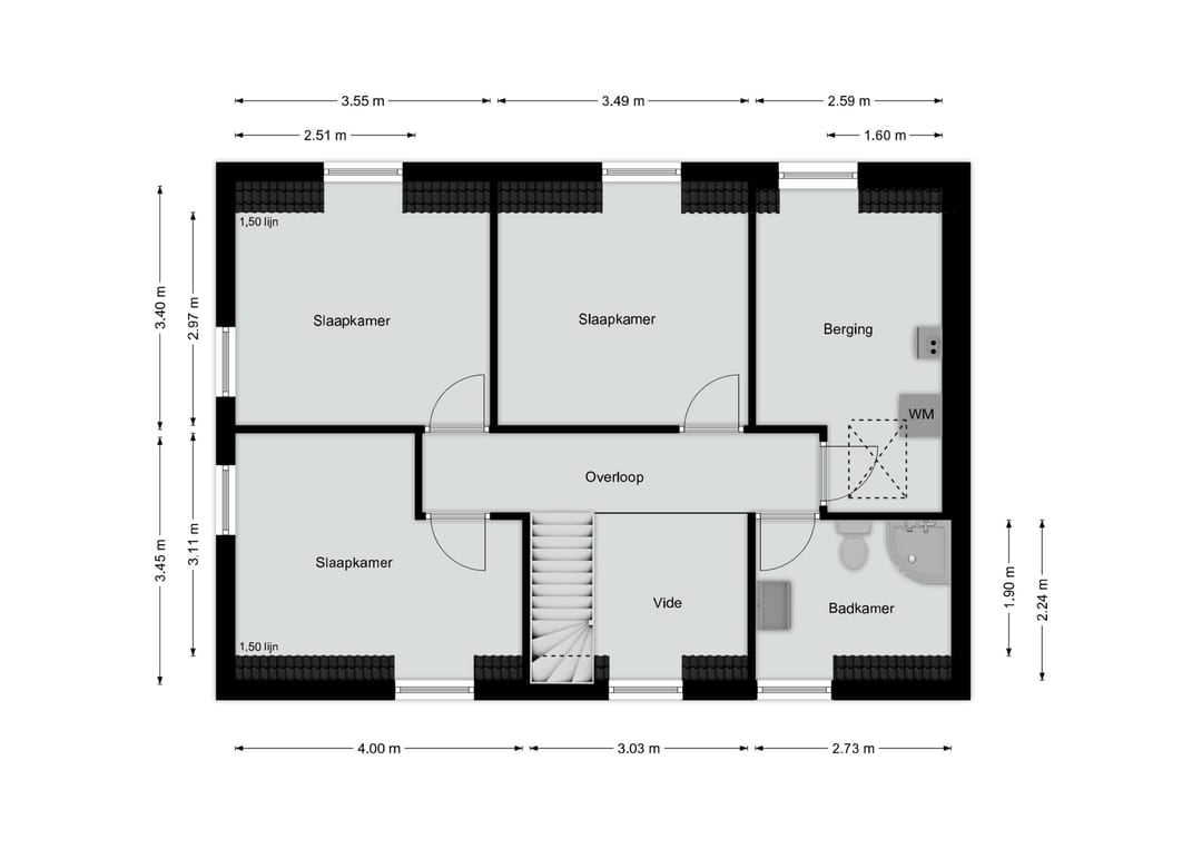 Overloop met vide, toegang tot drie slaapkamers (allen ca. 11 m²) voorzien van laminaatvloeren en dakkapellen. De hoofdslaapkamer beschikt over airco (2023).