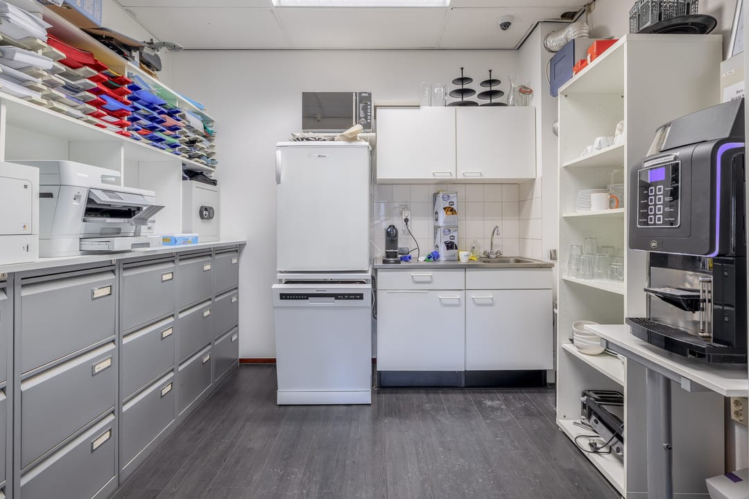 Kantoorruimte van circa 80 m², ook deze ruimte is vrij indeelbaar, systeemplafond met inbouwarmaturen en pantry.