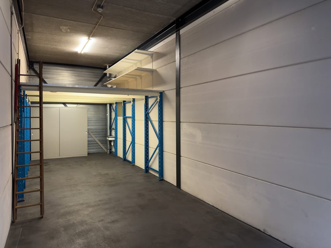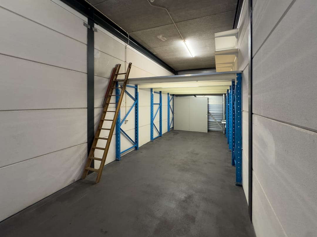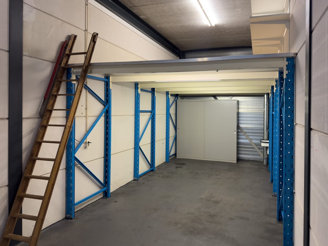 De unit is praktisch ingedeeld en voorzien van een stellingconstructie met extra opslagniveau van circa 15 m², uitgevoerd in stalen constructie met hoge draagkracht. Dit biedt extra vloeroppervlak voor goederenopslag of lichte werkzaamheden.