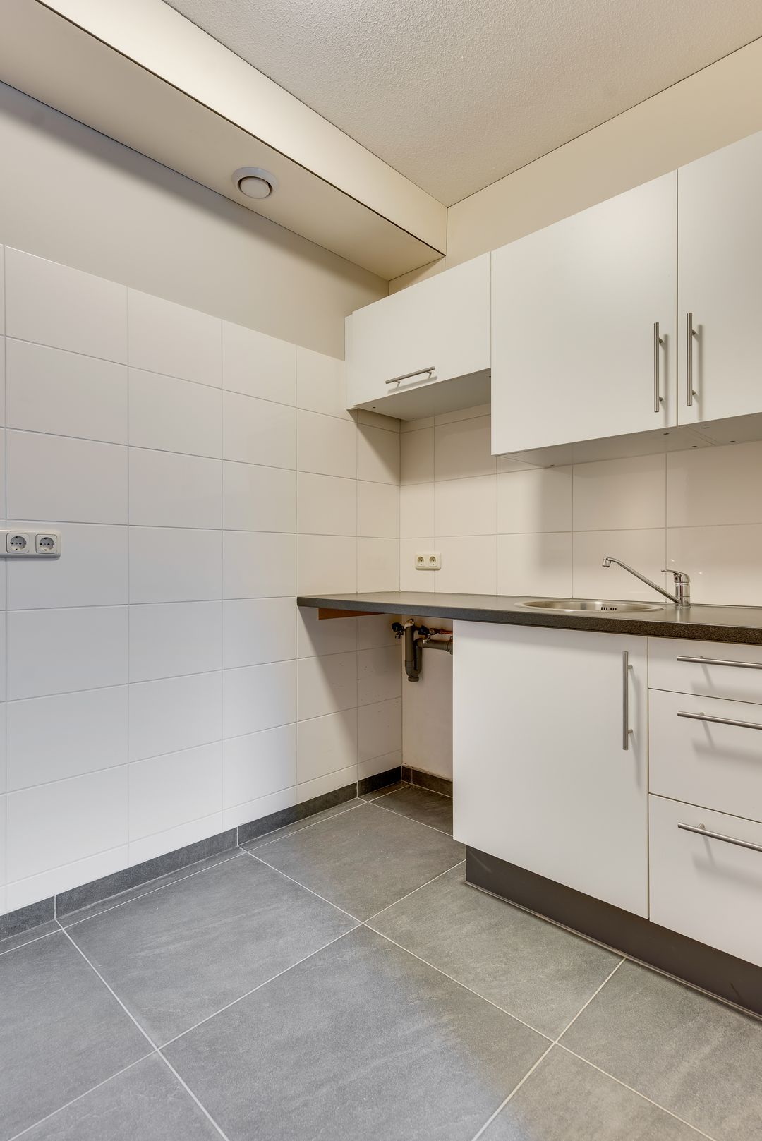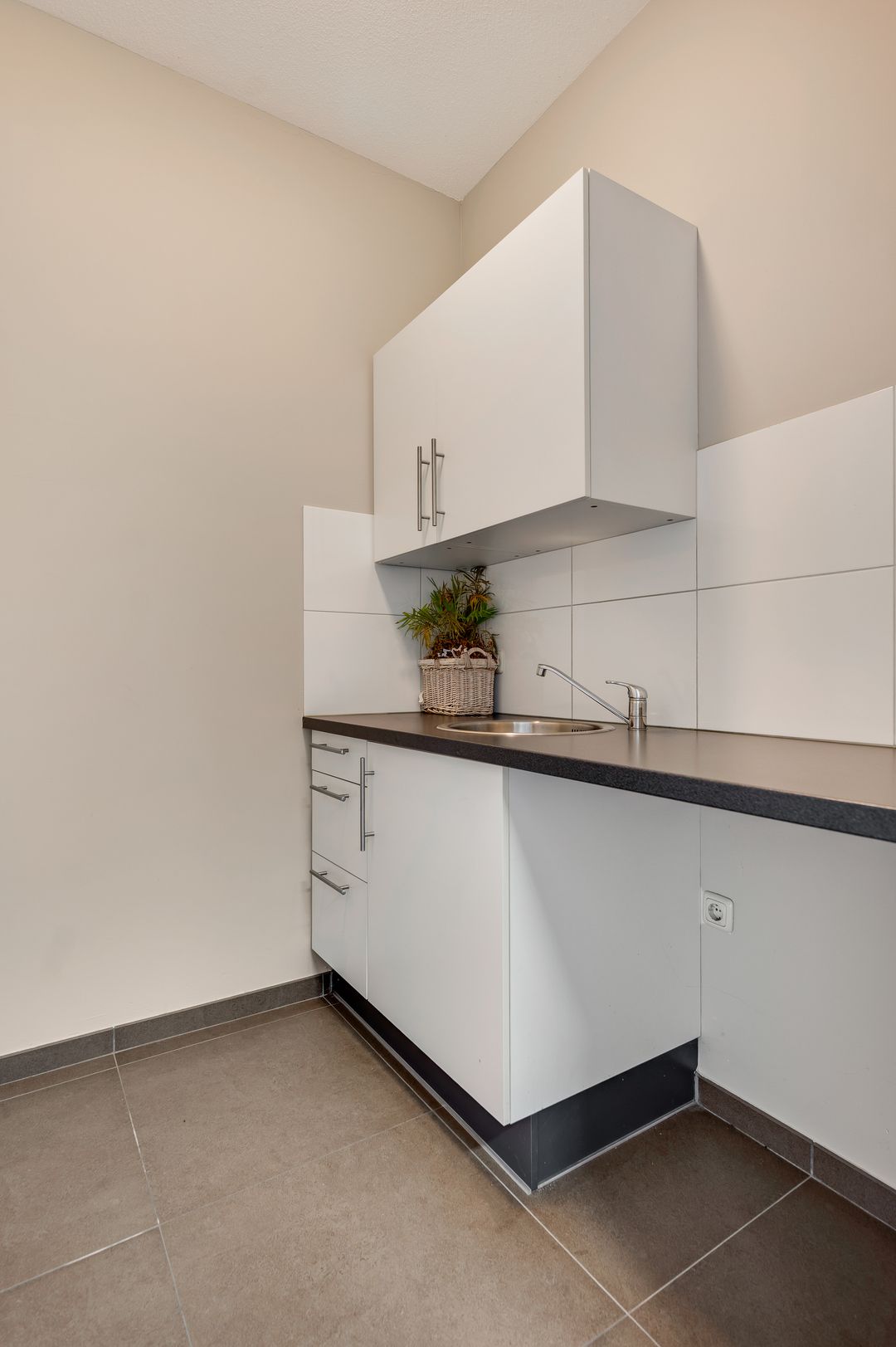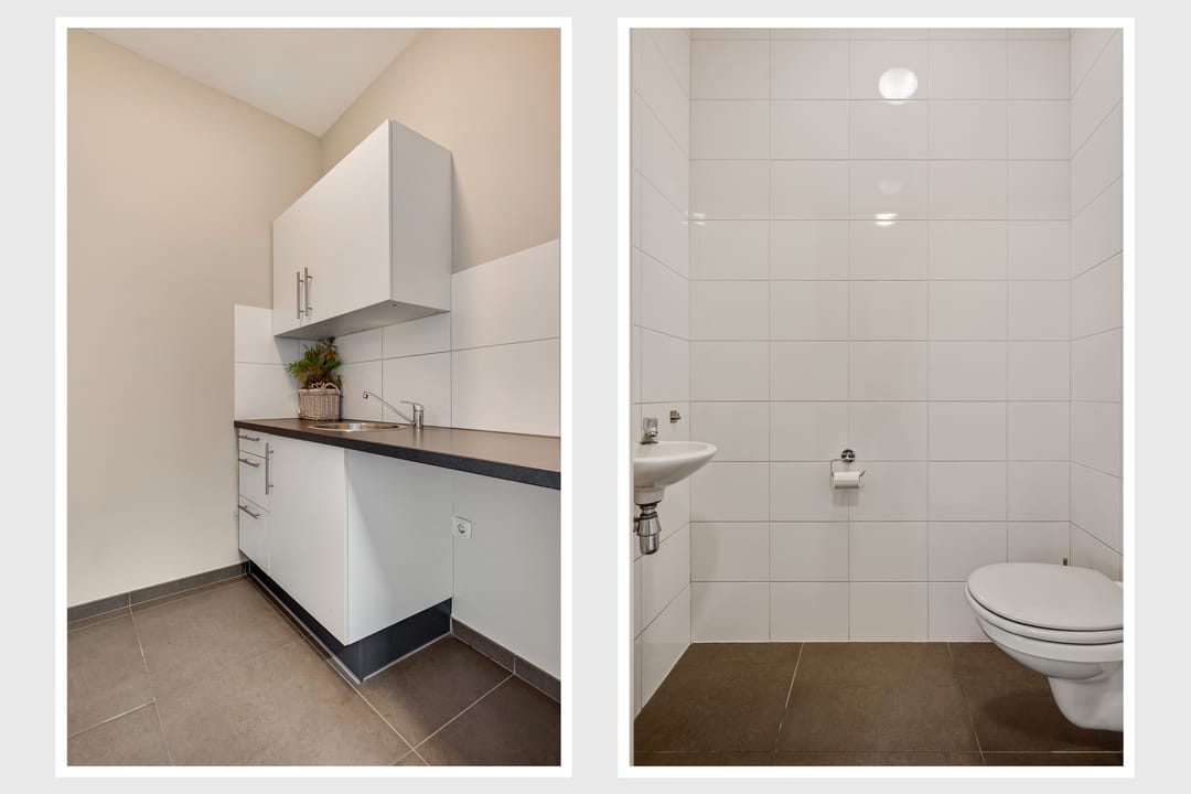 De kantoorruimte is afgewerkt met een tegelvloer, ingebouwde kastruimte en TL-verlichting. Aan de achterzijde bevindt zich een pantry met modern keukenblok, voorzien van spoelbak, kraan en aansluitingen voor een koelkast of vaatwasser. Daarnaast is er een aparte toiletruimte aanwezig.
