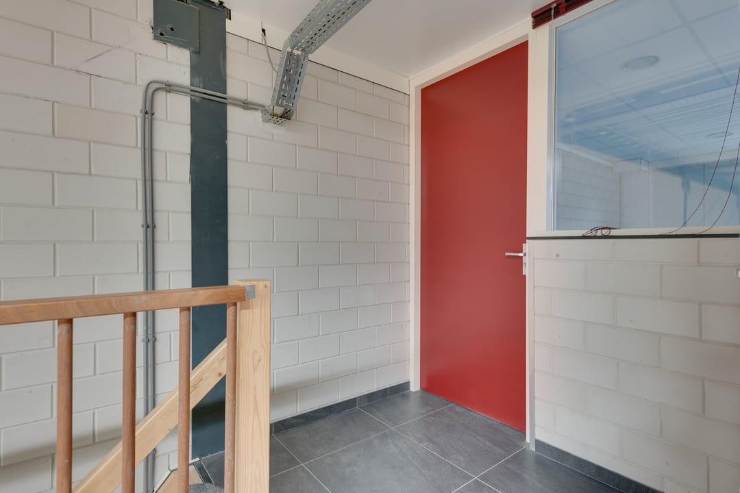 Op de eerste verdieping bevindt zich een tweede kantoorruimte van circa 27 m², eveneens voorzien van een tegelvloer, systeemplafond en verwarming via radiatoren. Aangrenzend is er een extra opslagruimte met een oppervlakte van circa 102 m². Deze verdieping is bereikbaar via een trap in de bedrijfsruimte en is uitgevoerd met een houten vloerconstructie met valbeveiliging door middel van een uitneembare balustrade. Dit maakt de ruimte praktisch en veilig te gebruiken voor opslag of lichte werkactiviteiten.