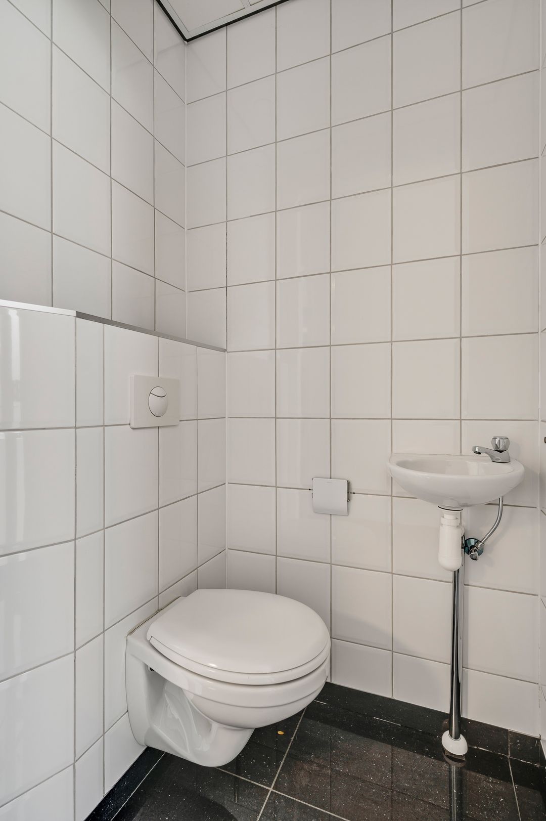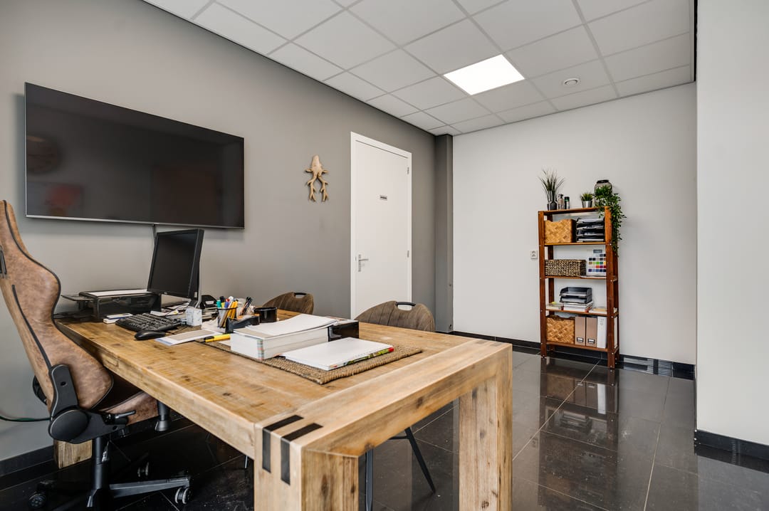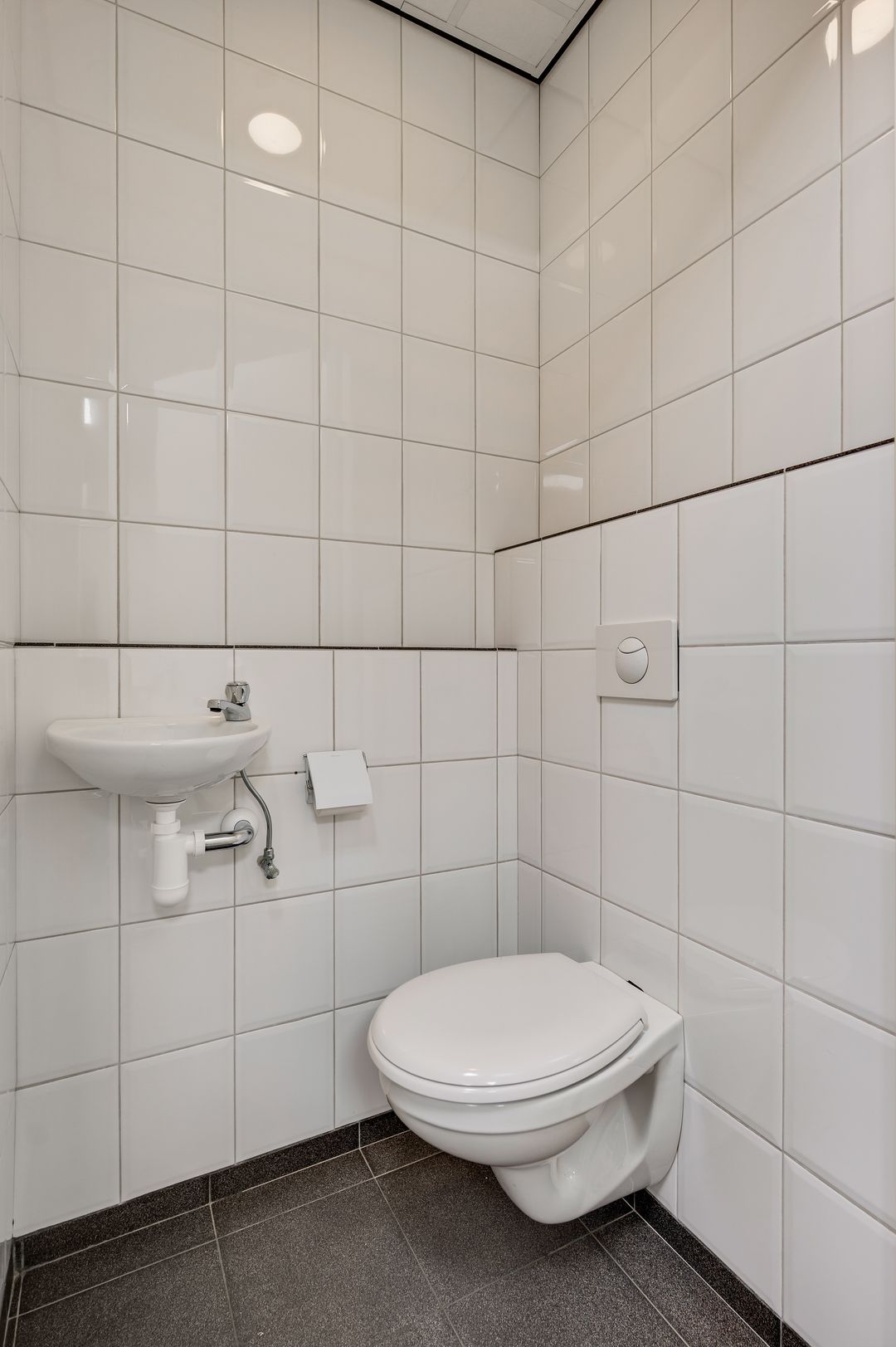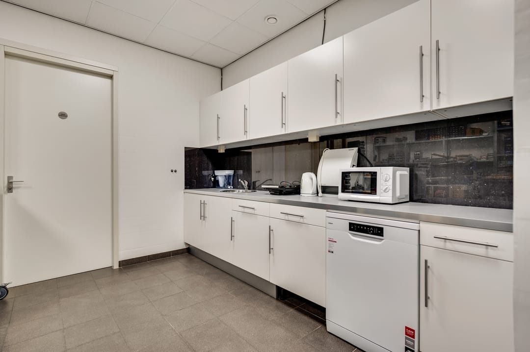 Aansluitend ligt de kantine, eveneens voorzien van een systeemplafond en tegelvloer. Hier zijn een keukenblok en een tweede toiletruimte aanwezig. Vanuit de kantine is de bedrijfsruimte rechtstreeks toegankelijk.