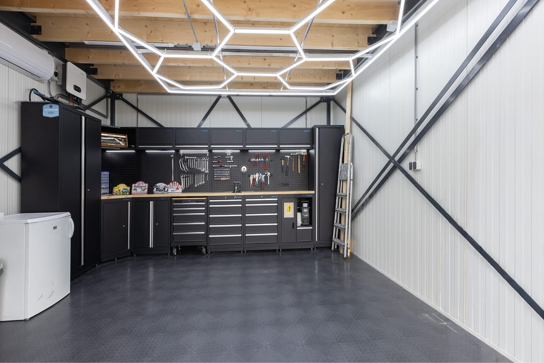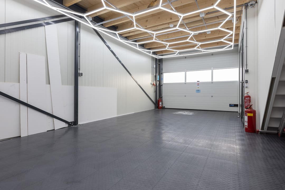De unit is voorzien van een elektrische overheaddeur met twee afstandsbedieningen en een separate loopdeur, en is volledig geïsoleerd.