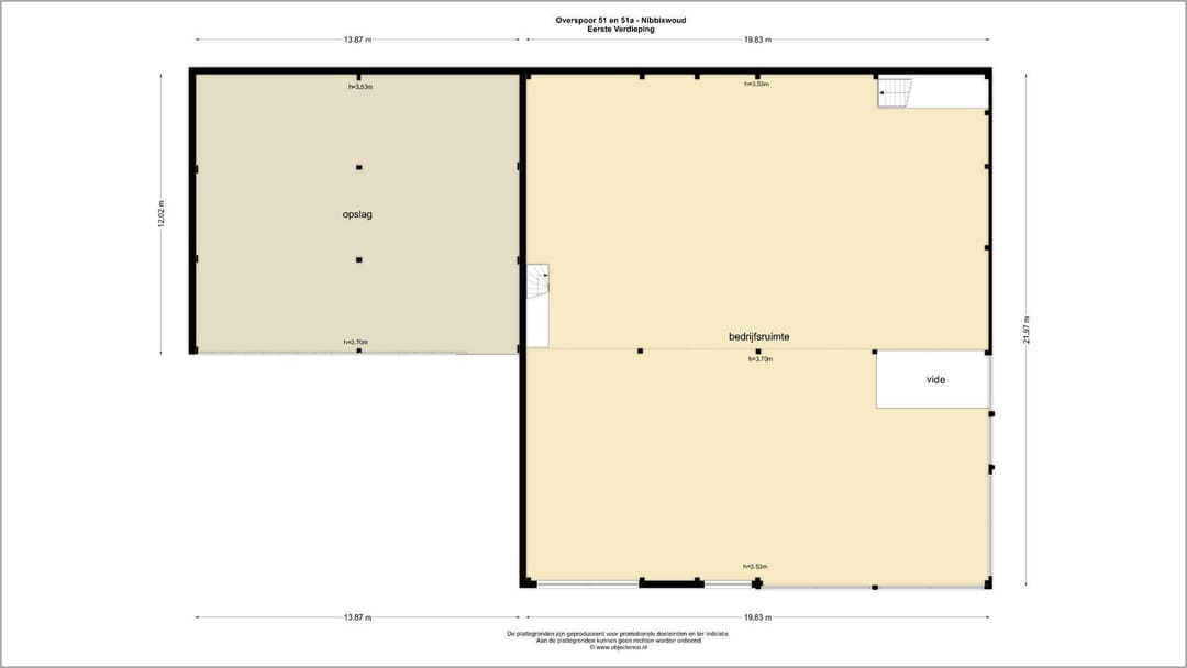Overspoor 51 beschikt over circa 450 m² bruto vloeroppervlakte bedrijfsruimte op de begane grond en een verdiepingsvloer (in beton uitgevoerd) van circa 440 m² bvo.