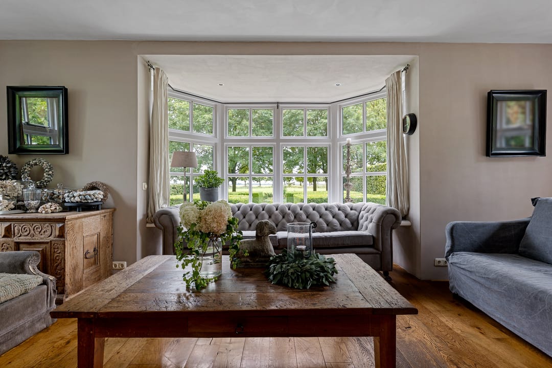 - Hardhouten kozijnen rondom met dubbel beglazing (deels HR+ en HR++ beglazing);