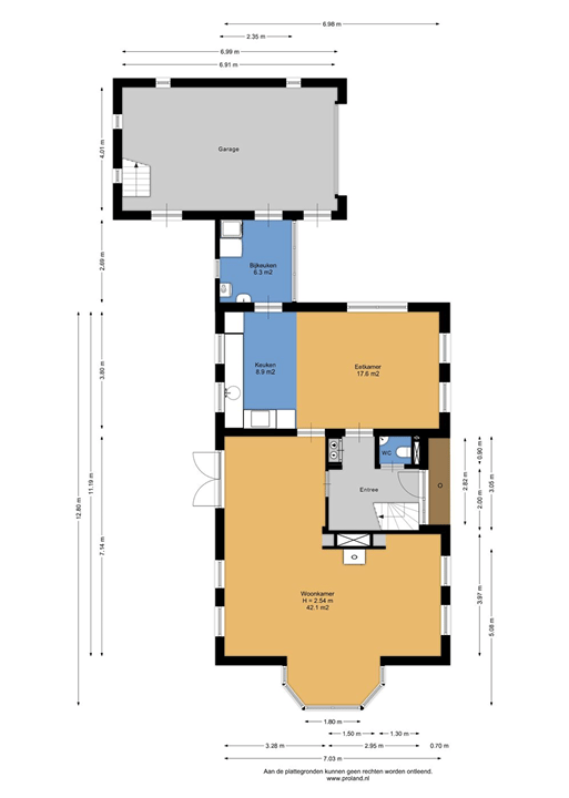 Begane grond: entree/hal met meterkast, toilet en trapopgang, woonkamer van ca. 42 m² met schouw en tuindeuren, eetkamer van ca. 18 m², woonkeuken van ca. 9 m² met moderne aanbouwkeuken en bijkeuken van ca. 6 m², met toegang tot de aangebouwde garage.