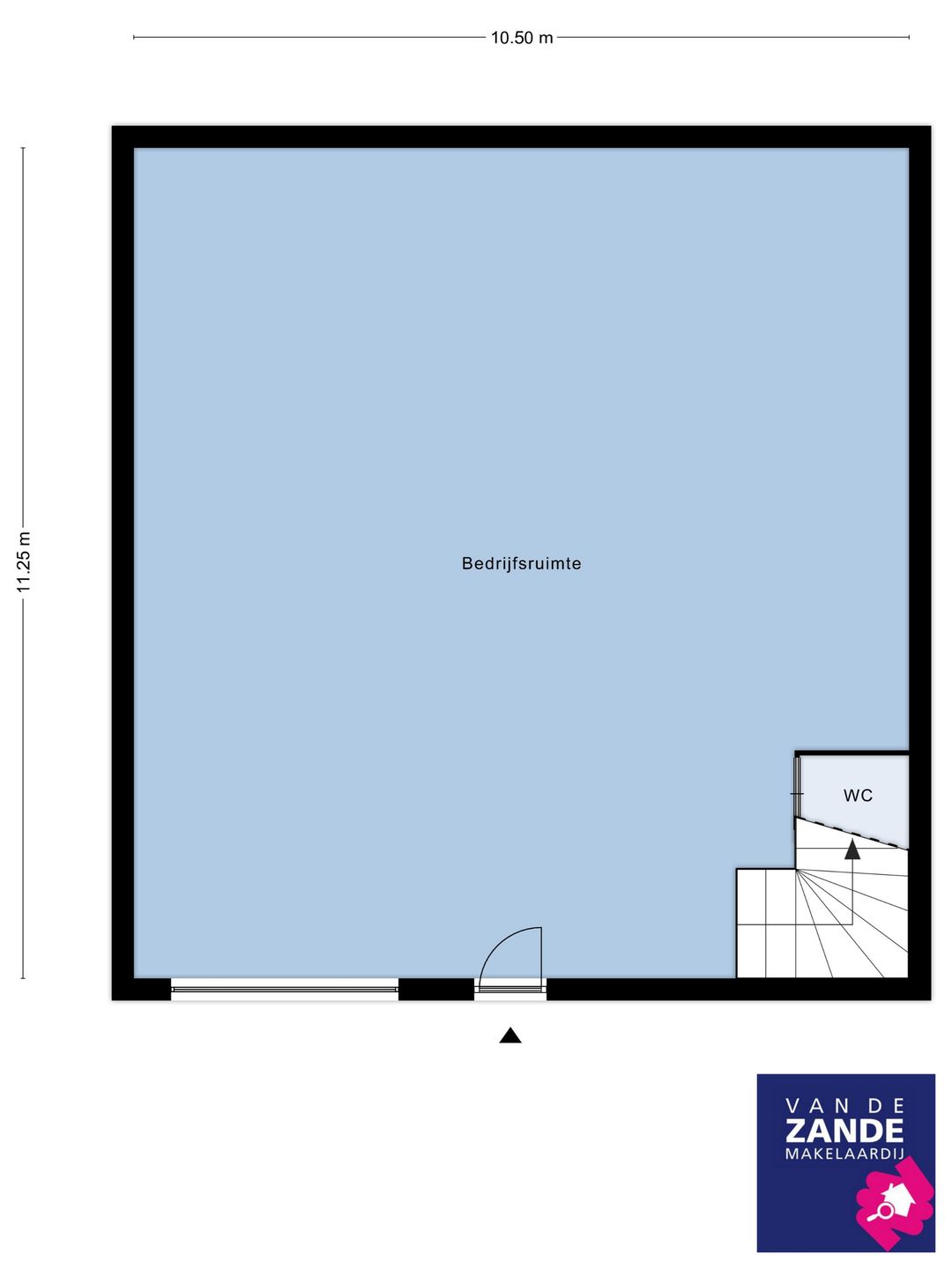 Entree, open bedrijfsruimte, toilet, trapopgang naar verdieping.