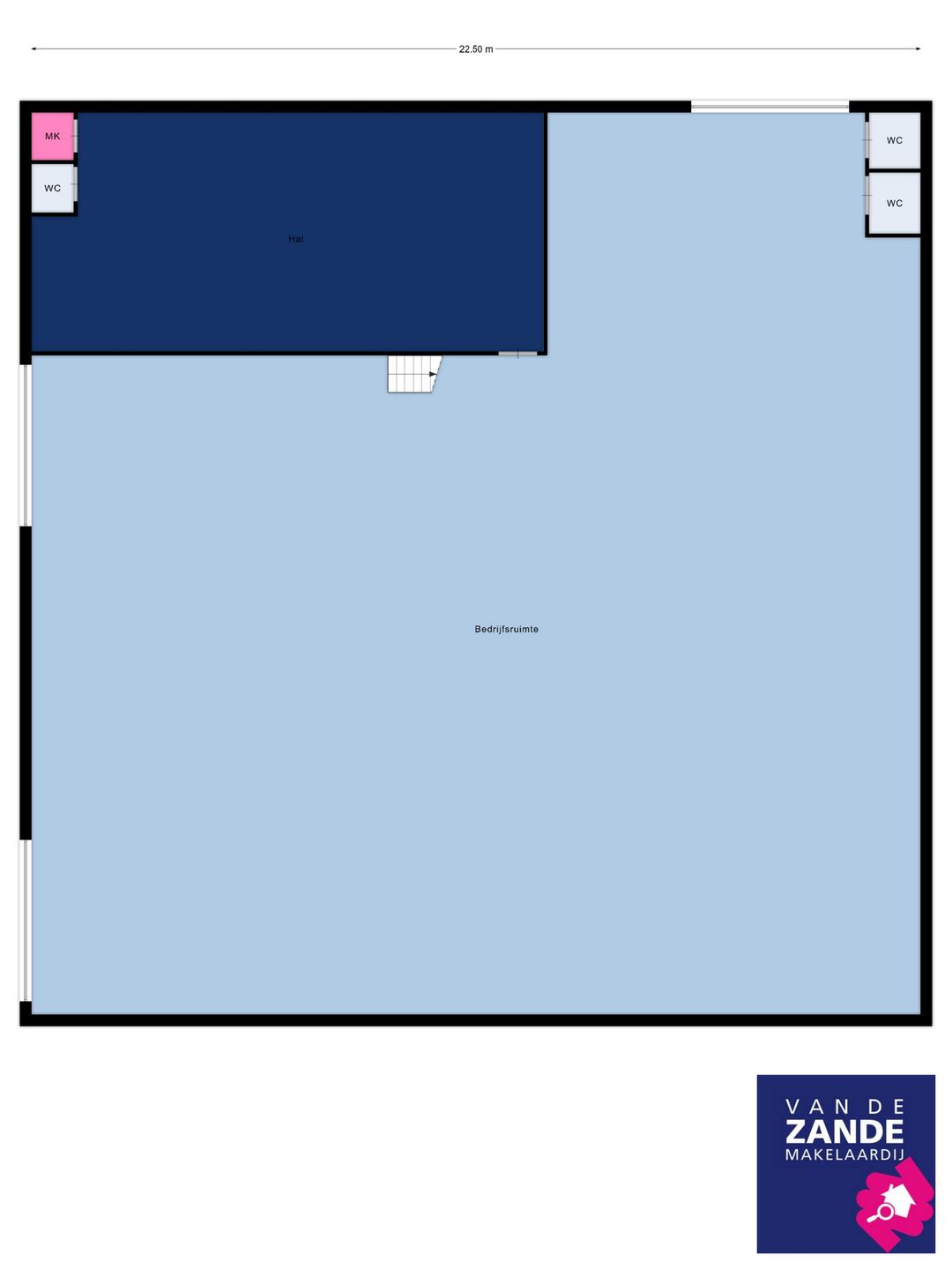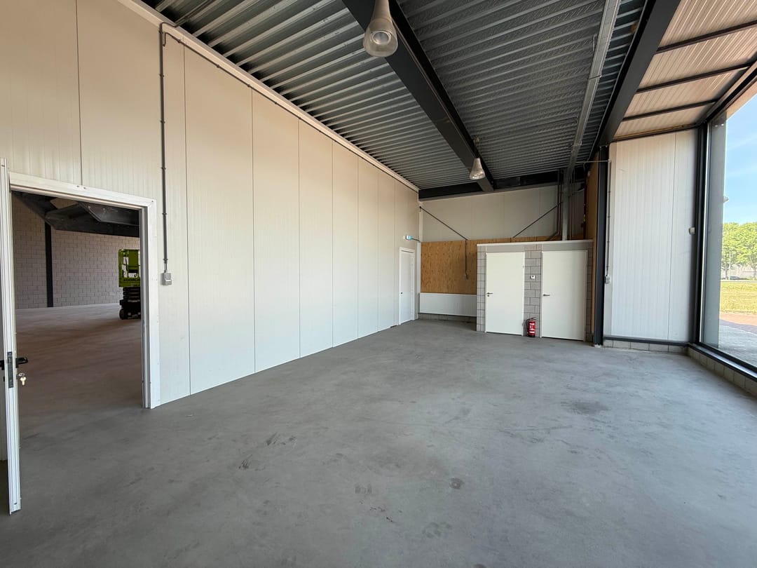 Entree, open bedrijfsruimte, toiletten, trapopgang naar kantoorverdieping.