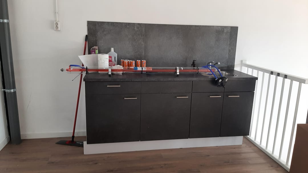 Trapopgang naar de 1e verdieping, de etage is voorzien van een keukenblok, laminaatvloer en airco.