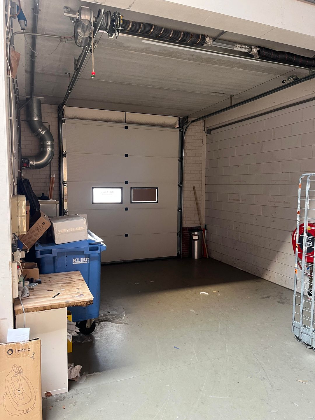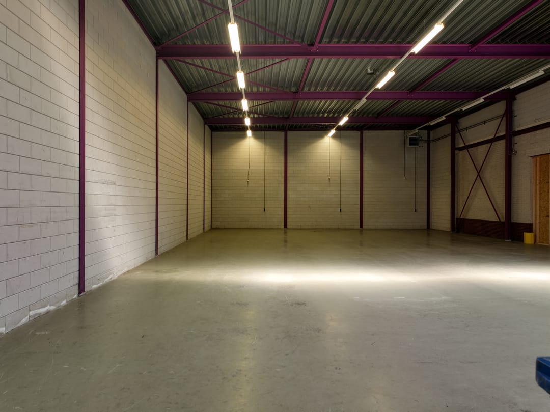 - Lichtstraten, overheaddeuren, betonvloer, heater, toilet en pantry
