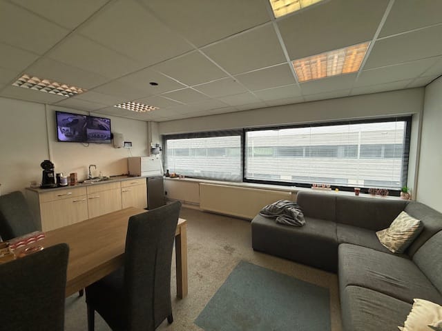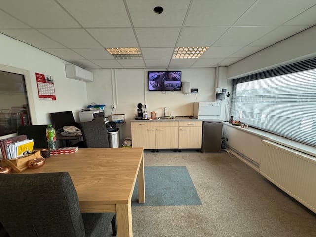 CV-installatie met radiatoren, systeemplafonds, lichtarmaturen en scheidingswanden in de kantoorruimte, keukenblok en betegeld toilet.