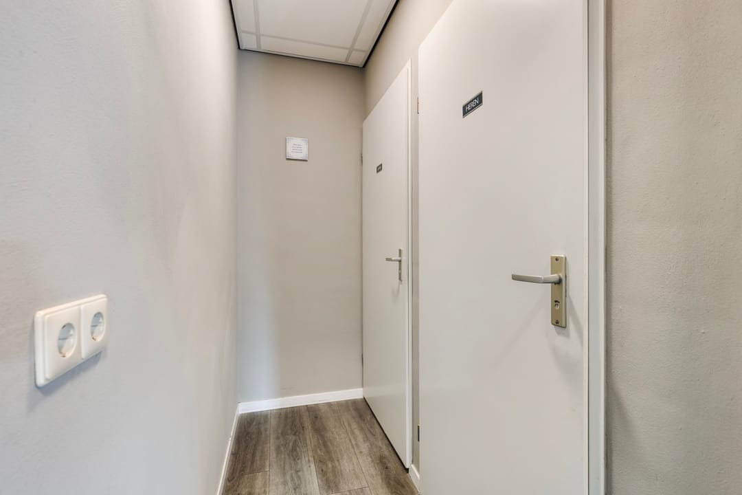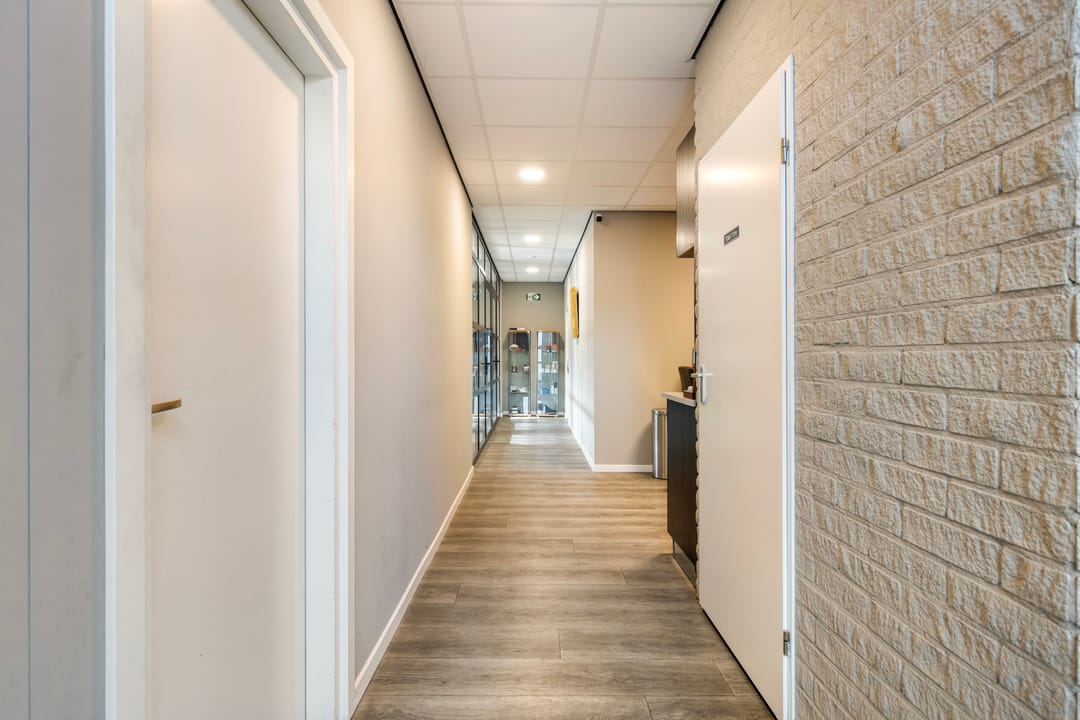 Entree/hal: ontvangstgang langs drie kantoorruimtes, keuken/pantry en berging.