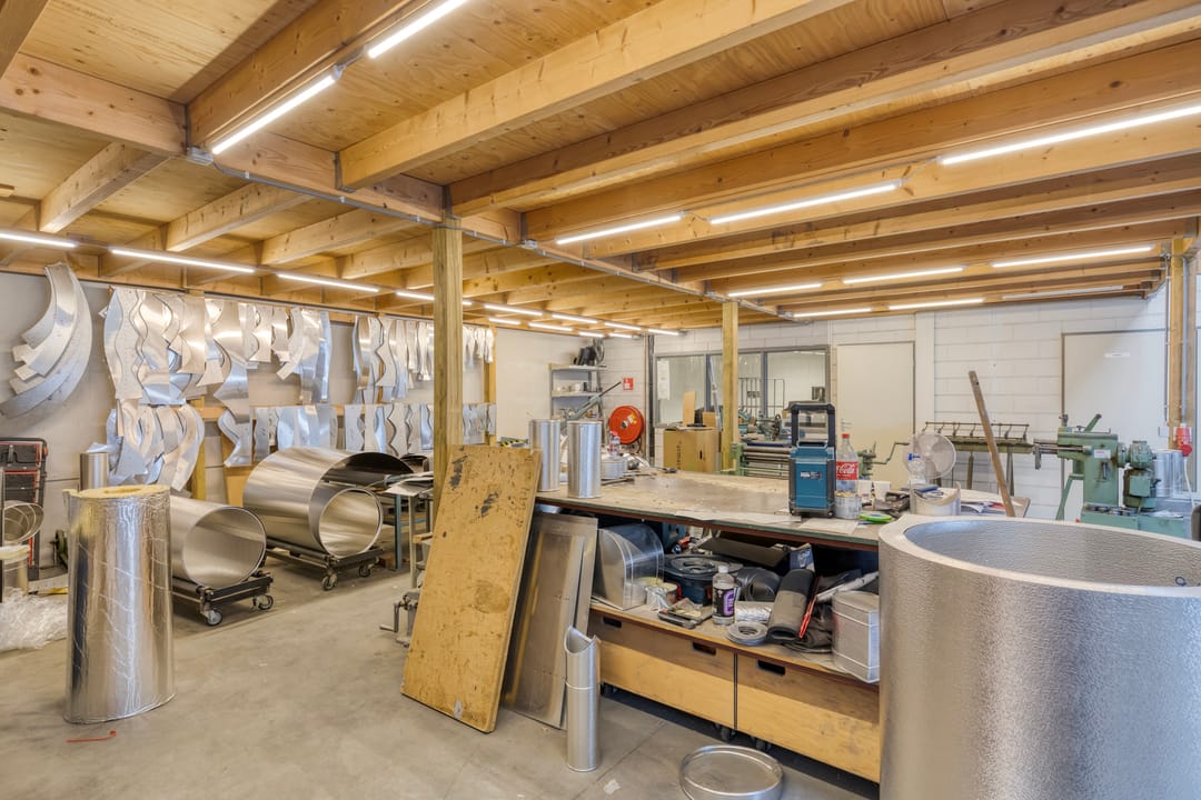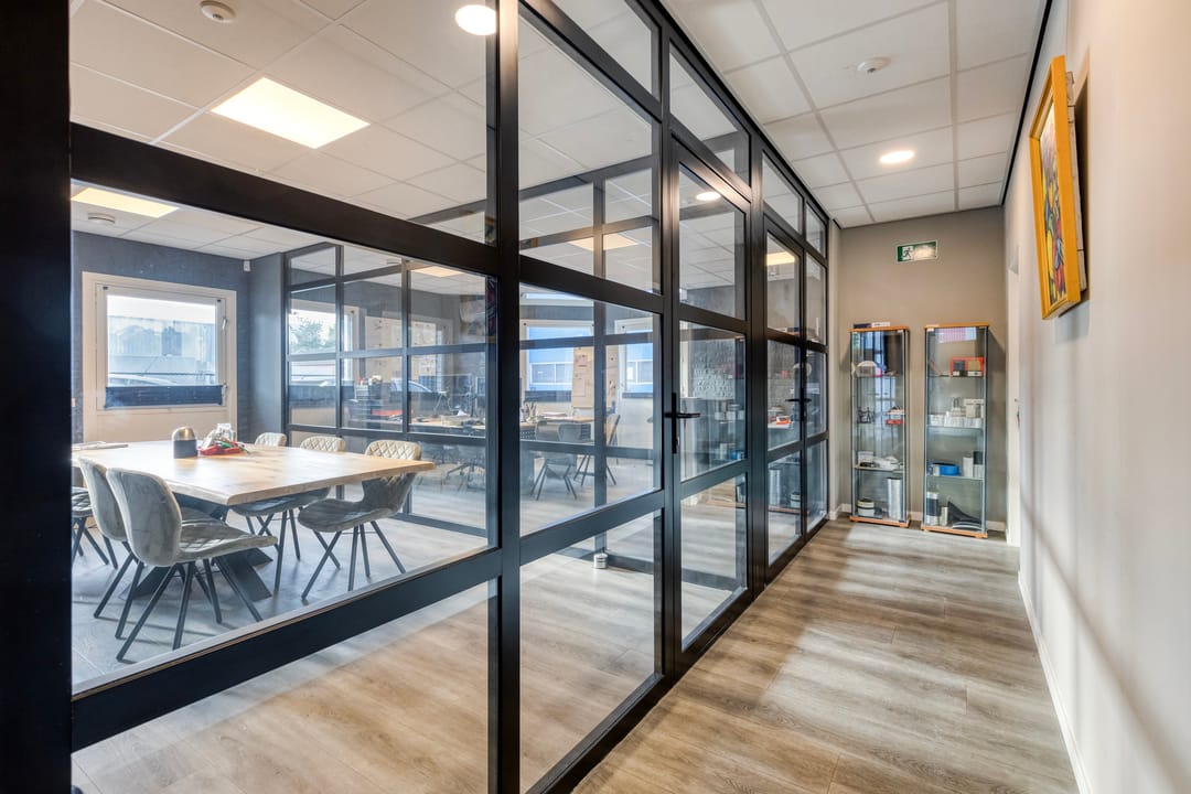 Bedrijfshal 2: doorlopend naar een tweede, grote hal met overheaddeur.