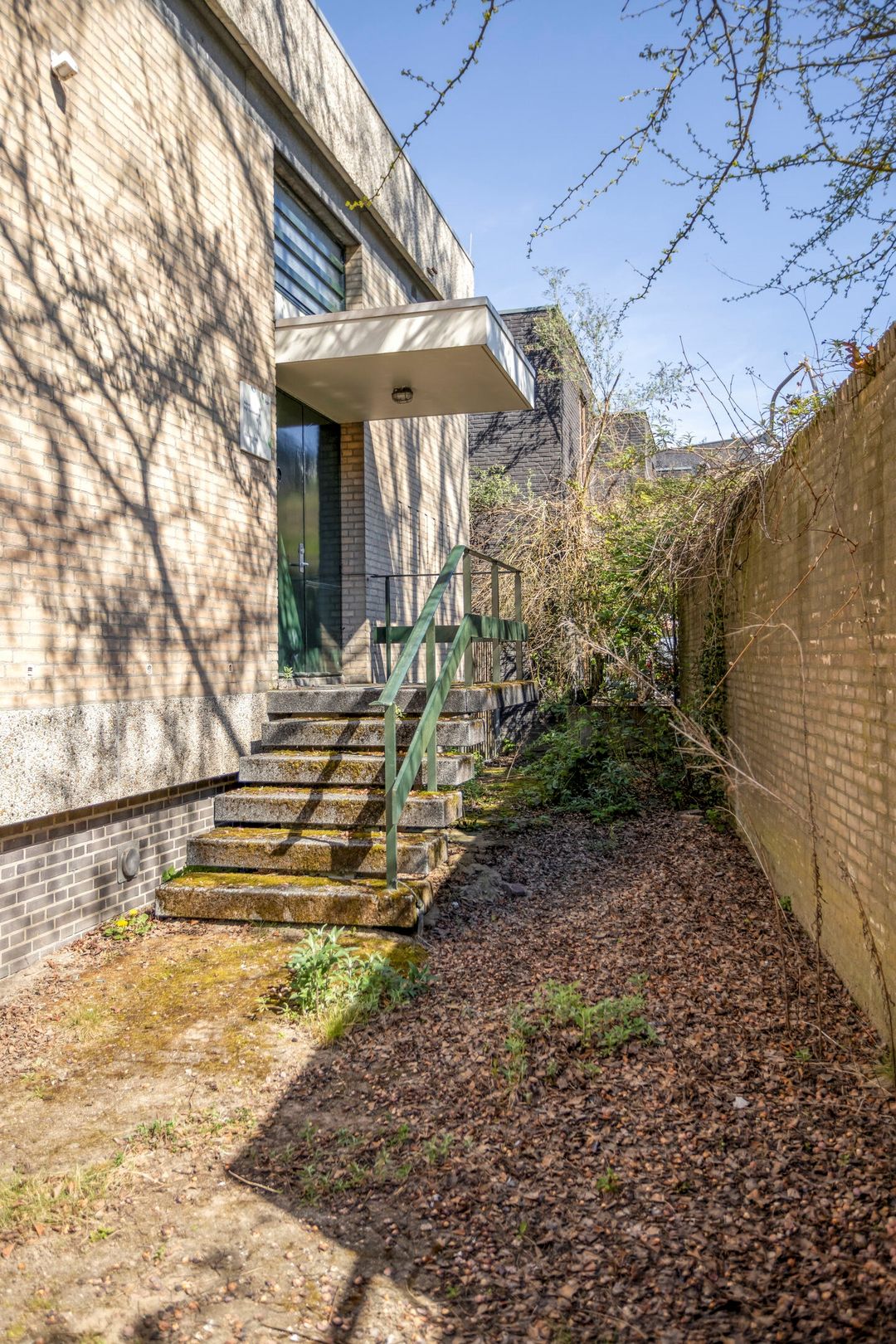 Aan de zijde van het gebouw bevindt zich een overkapping, die fungeert als entreezone. Deze overdekte toegang vormt de overgang tussen buiten en binnen en leidt direct naar de centrale verkeersruimte.