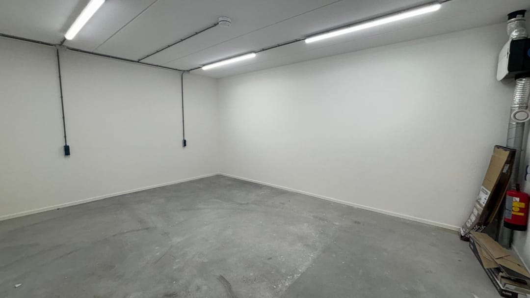 De begane grond heeft een oppervlakte van circa 60 m² en is praktisch ingericht. De vlak afgewerkte betonnen vloer, aanwezige verwarming, toiletruimte en de ruime hoeveelheid verlichting en stopcontacten zorgen voor een functionele en comfortabele werkomgeving. Daarnaast beschikt de unit over een elektrisch bedienbare overheaddeur én een separate loopdeur, wat het gebruiksgemak verder vergroot. Voor werkzaamheden met zwaardere apparatuur is bovendien een krachtstroomaansluiting aanwezig. In de koudere periodes biedt de elektrische heater extra comfort.