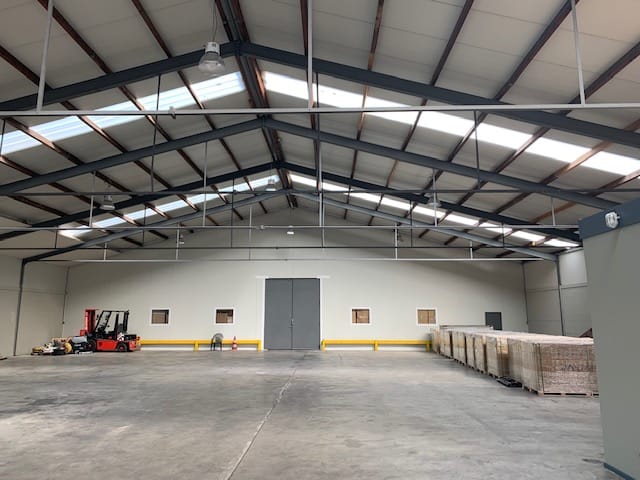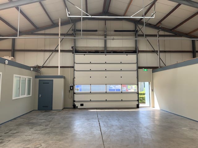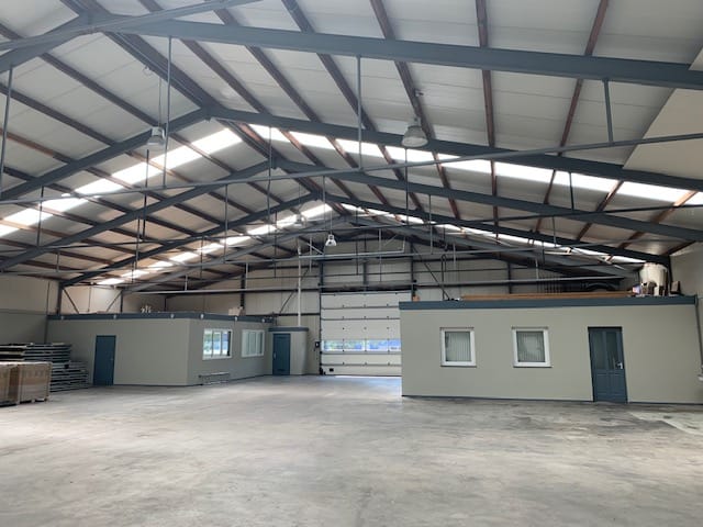 - Lichtstraten, overheaddeuren, krachtstroom, betonvloer, toilet, pantry, inbouwarmaturen en te openen ramen