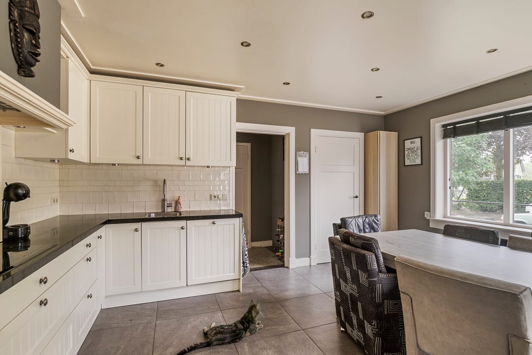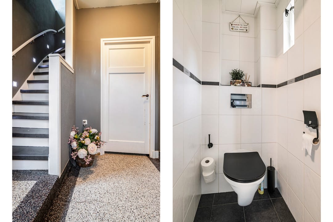 Entree met een trapopgang naar de eerste verdieping en een apart toilet. Vanuit de entree is er toegang tot de tussengang die leidt naar de woonkamer en woonkeuken. De landelijke keuken is voorzien van moderne apparatuur en heeft een gezellige eetruimte. Vanuit de keuken heeft u toegang tot de bijkeuken (met wasruimte) en de kelder waar zich een berging en een kantoorruimte bevindt.
