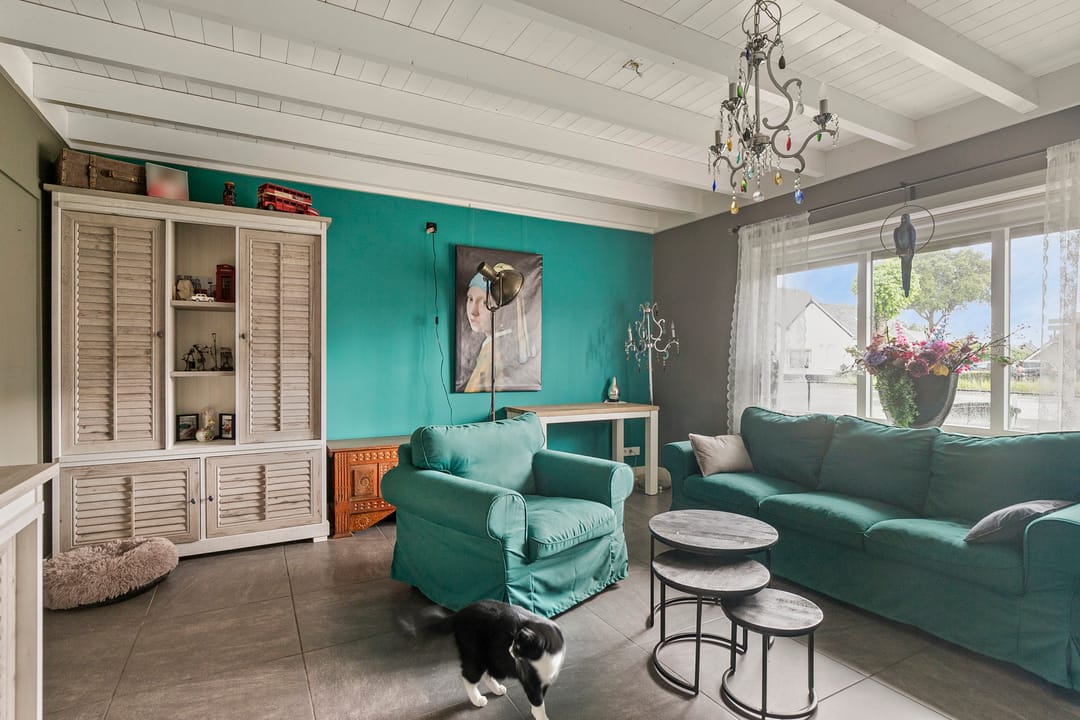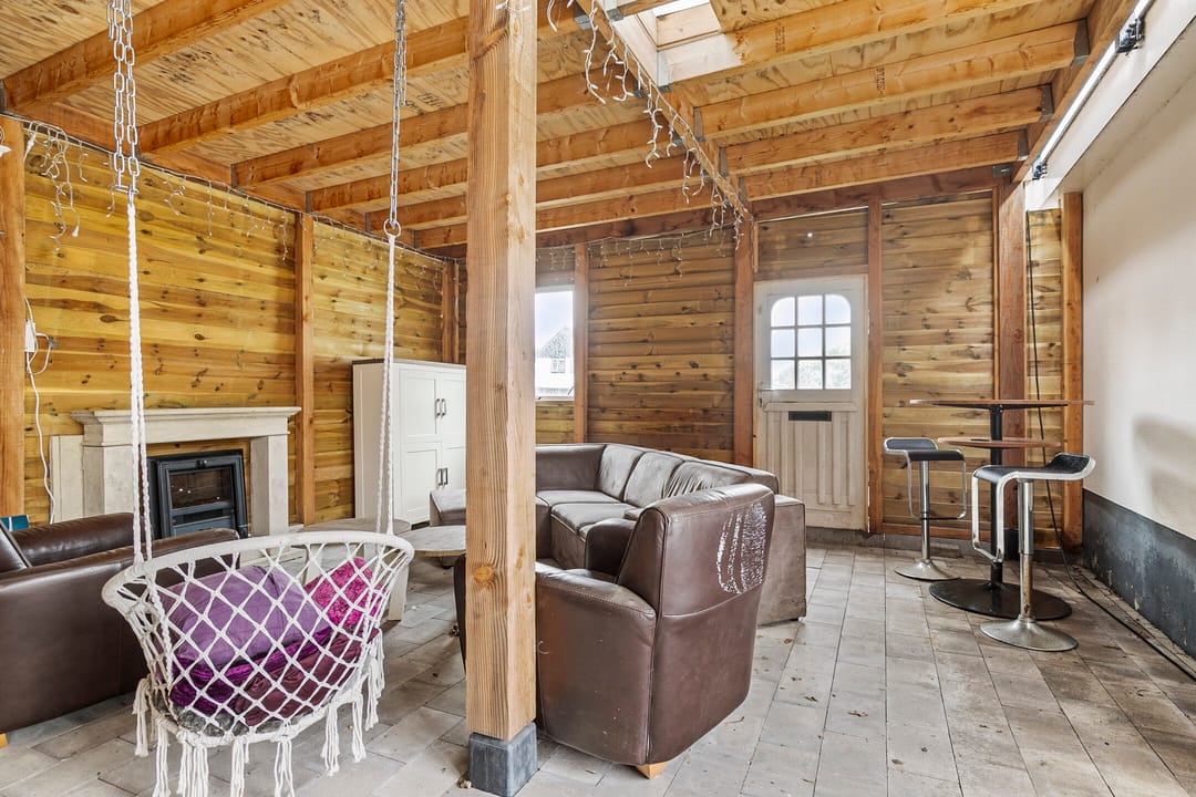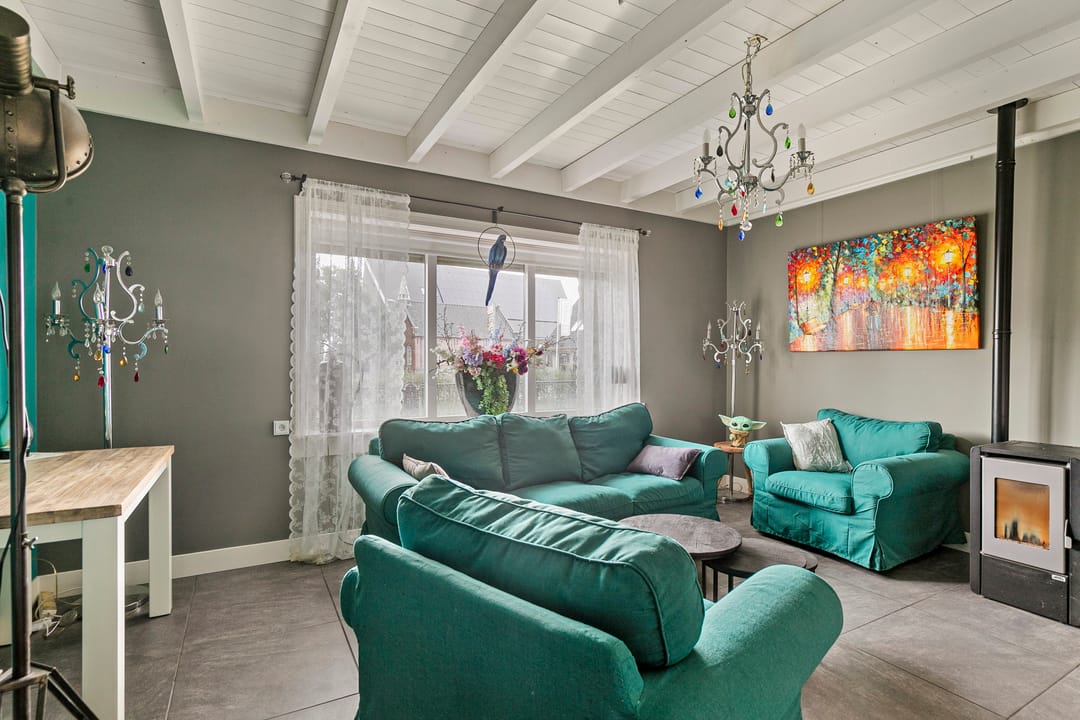 De sfeervolle woonkamer is voorzien van grote raampartijen, die zorgen voor veel natuurlijk licht, en een palletkachel.