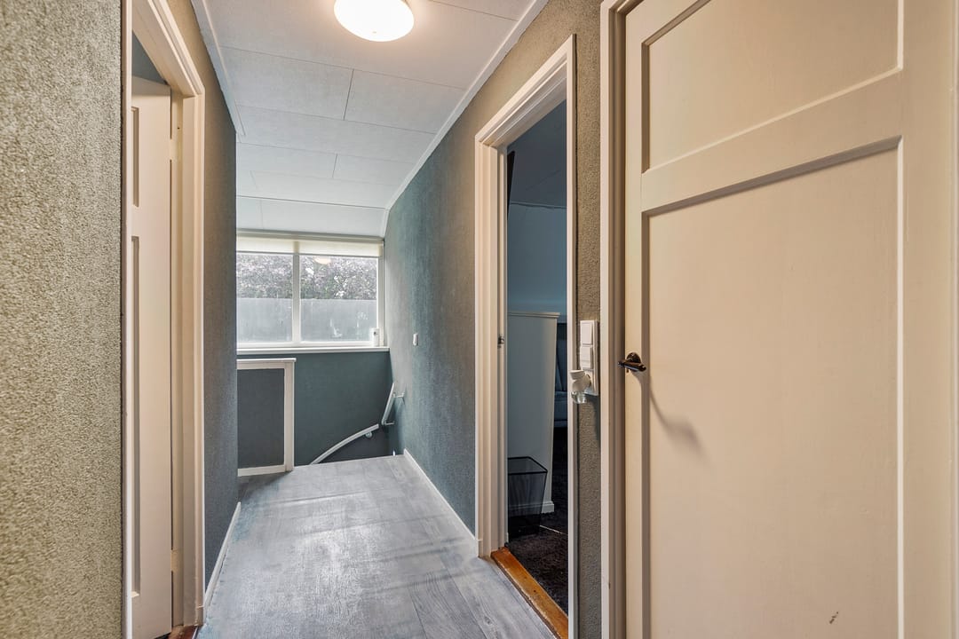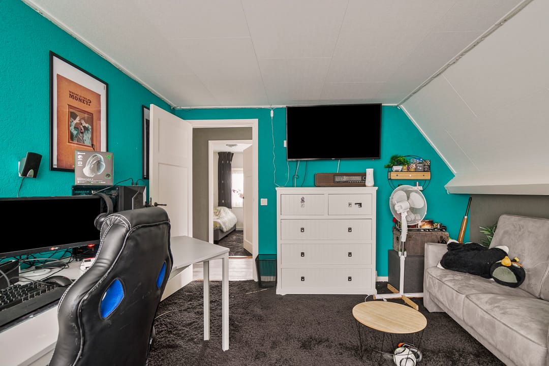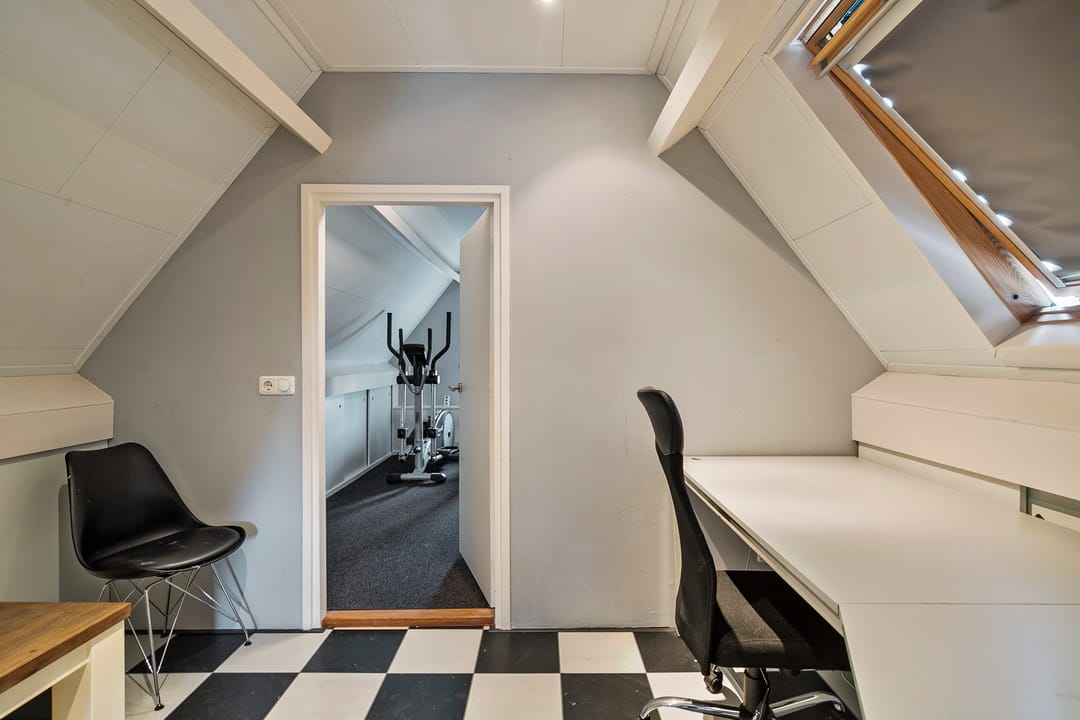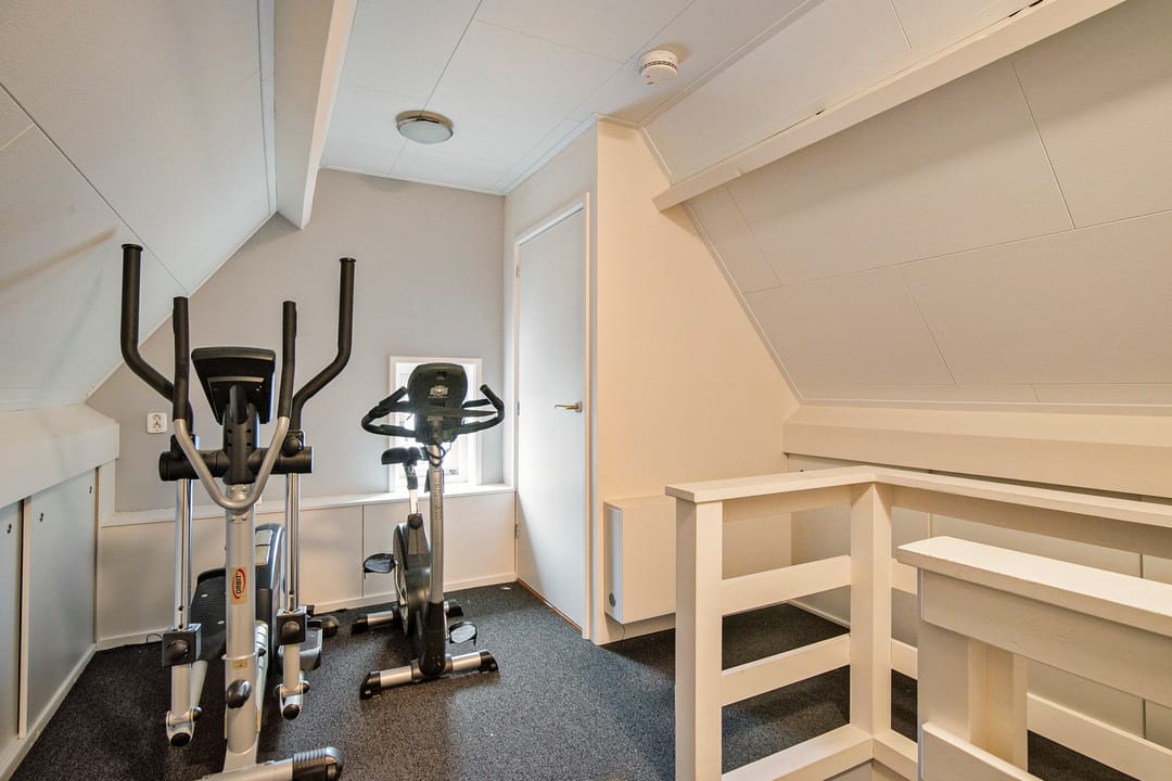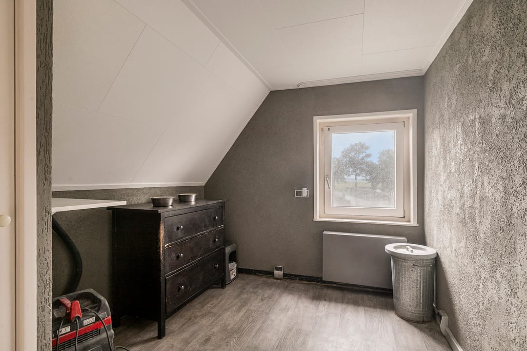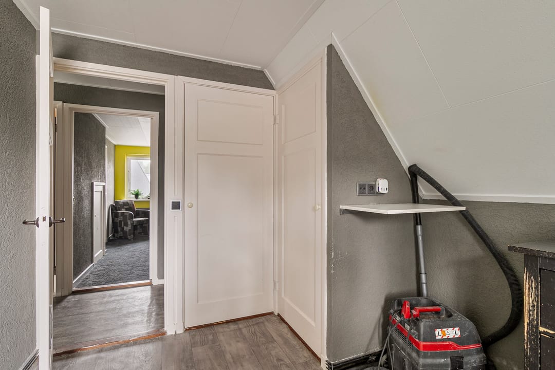 Grote overloop met veel knieschotten, ten behoeve van opslag, en een zesde slaapkamer. Hier hangt tevens de CV-ketel. De woning kan eventueel geheel gasloos functioneren wanneer de warmtepomp wordt aangesloten, deze is al aanwezig.