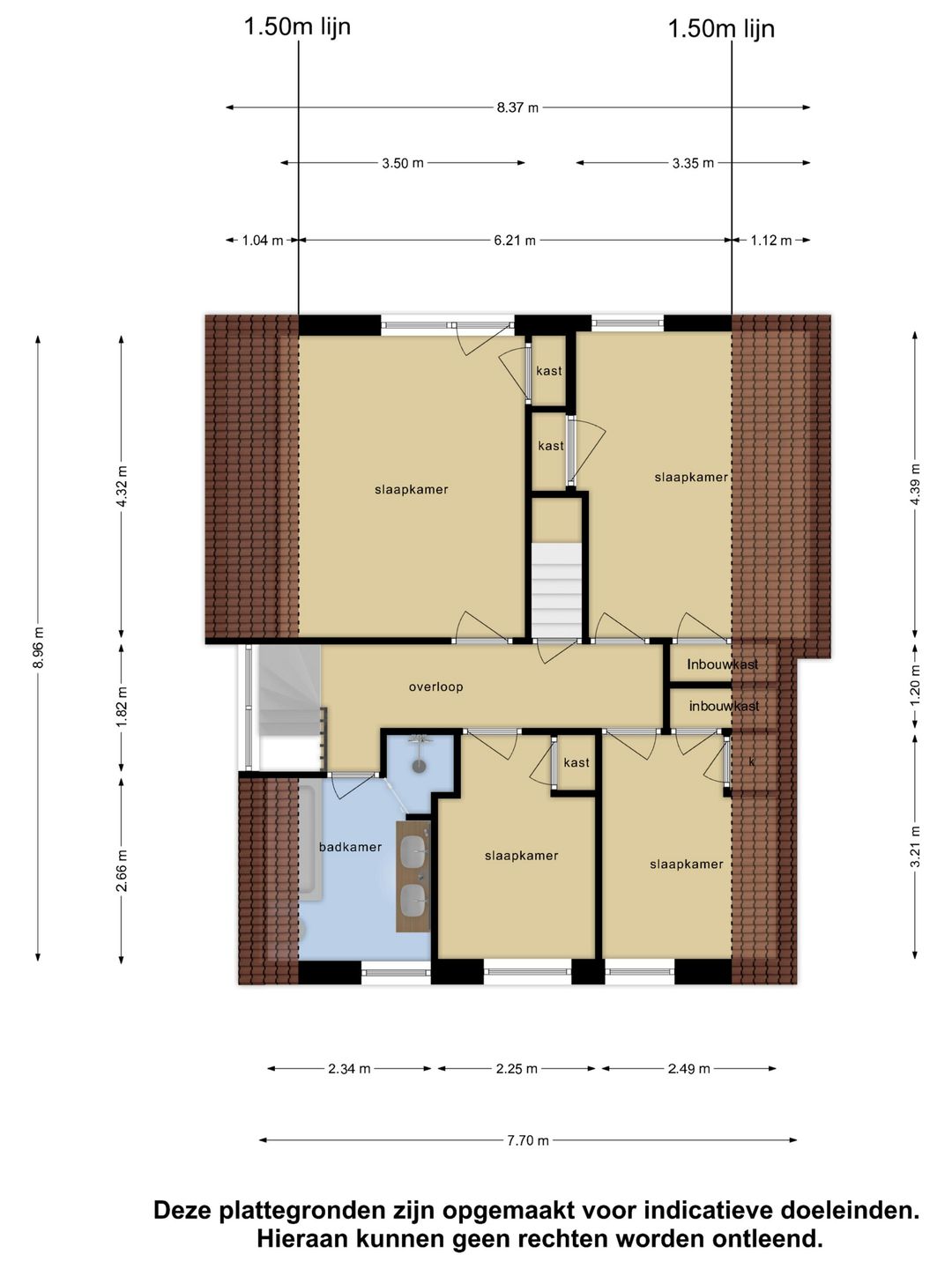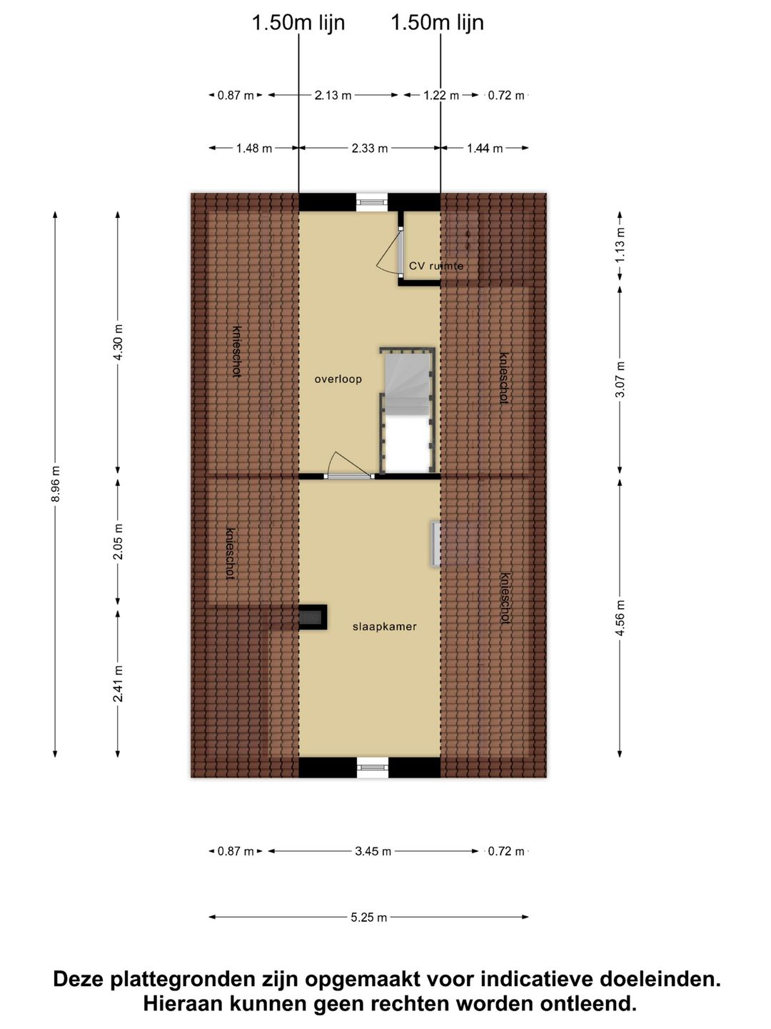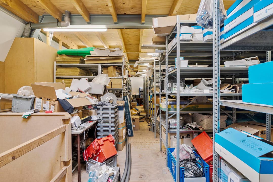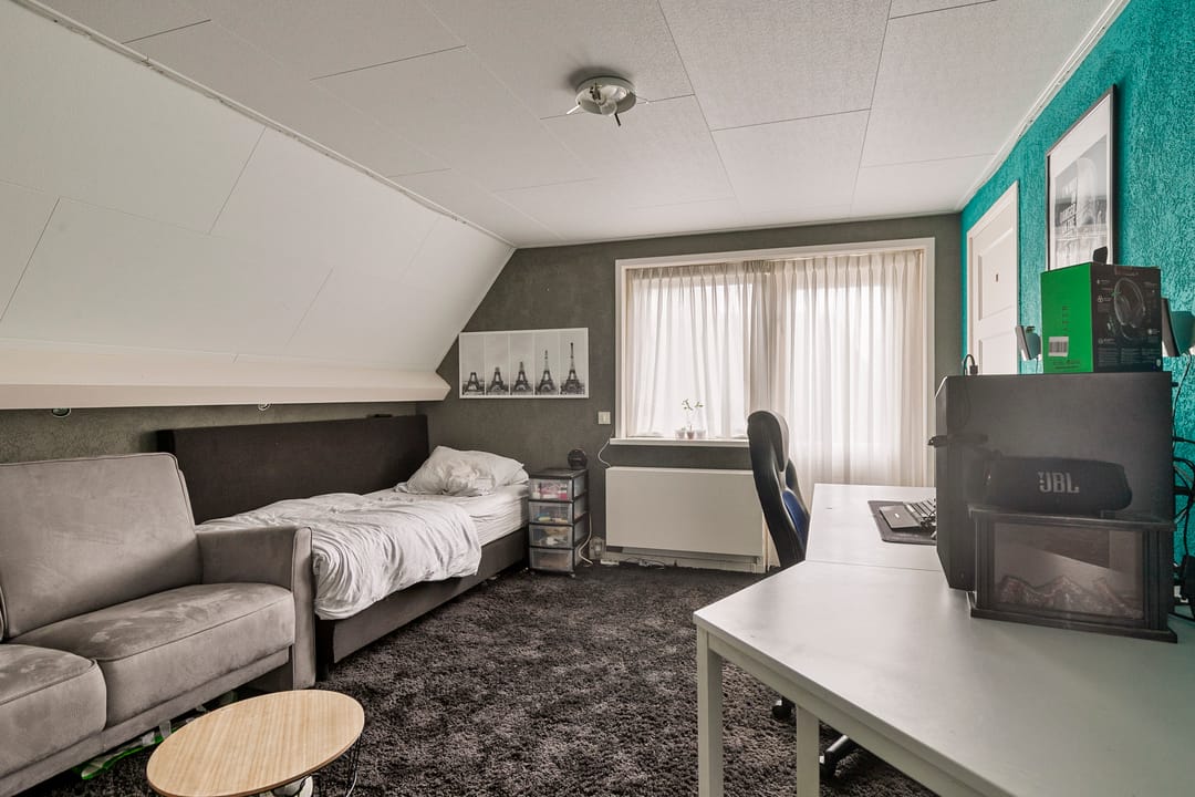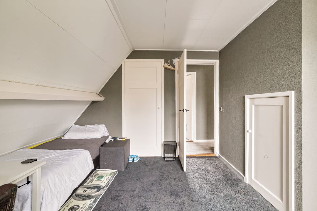 Grote overloop met veel knieschotten, ten behoeve van opslag, en een zesde slaapkamer. Hier hangt tevens de CV-ketel. De woning kan eventueel geheel gasloos functioneren wanneer de warmtepomp wordt aangesloten, deze is al aanwezig.