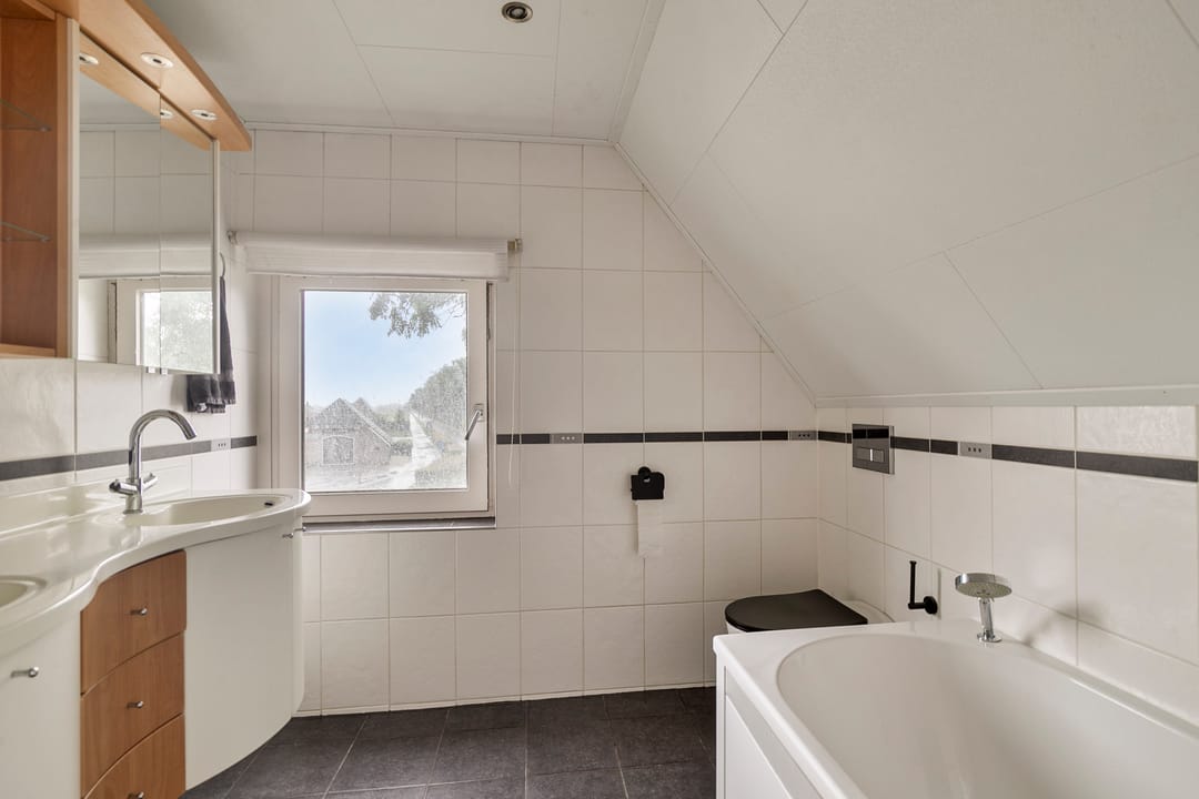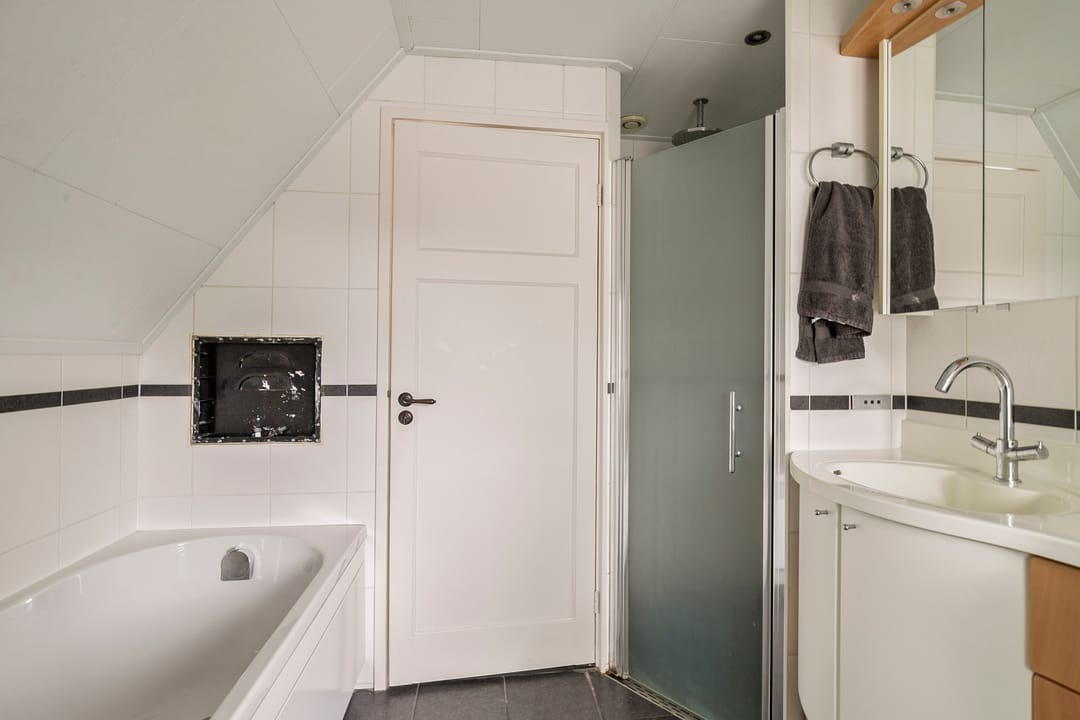 Op de eerste verdieping vier slaapkamers waarvan één met een balkon. Verder zijn de kamers voorzien van vaste kasten. De ruime badkamer heeft een dubbele wastafel, toilet, bad en een aparte douchehoek.