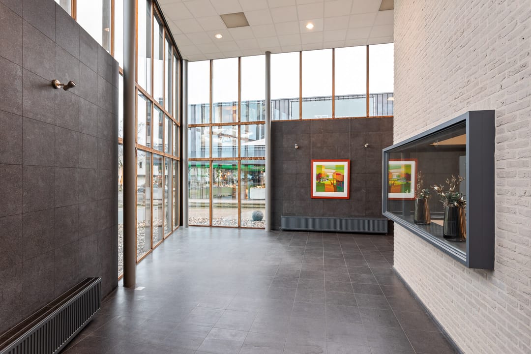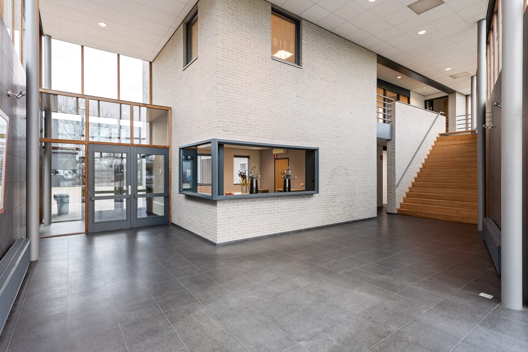 De entree maakt direct indruk. Een royale ontvangsthal met veel glas, hoogte en natuurlijk licht zorgt voor een open en professionele uitstraling. De eiken trap is een echte eyecatcher en onderstreept de kwaliteit van het gebouw. Dit is geen standaard binnenkomst, dit is een visitekaartje. Klaar om indruk te maken op klanten én medewerkers?