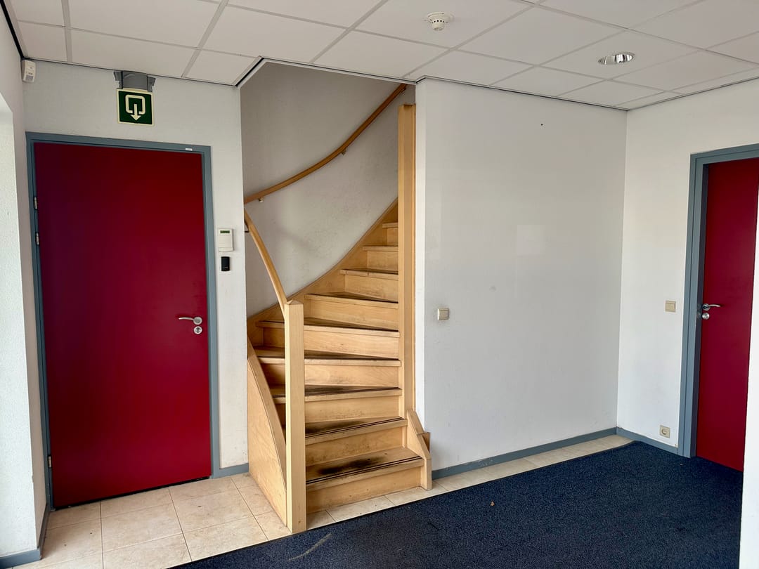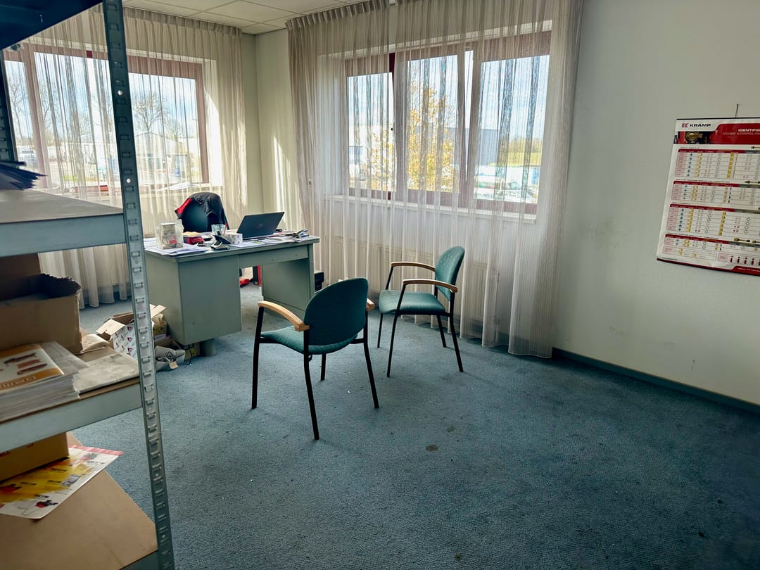 De kantoorruimte is functioneel ingericht en verdeeld over twee bouwlagen, met directe toegang tot de loods via de kantine.