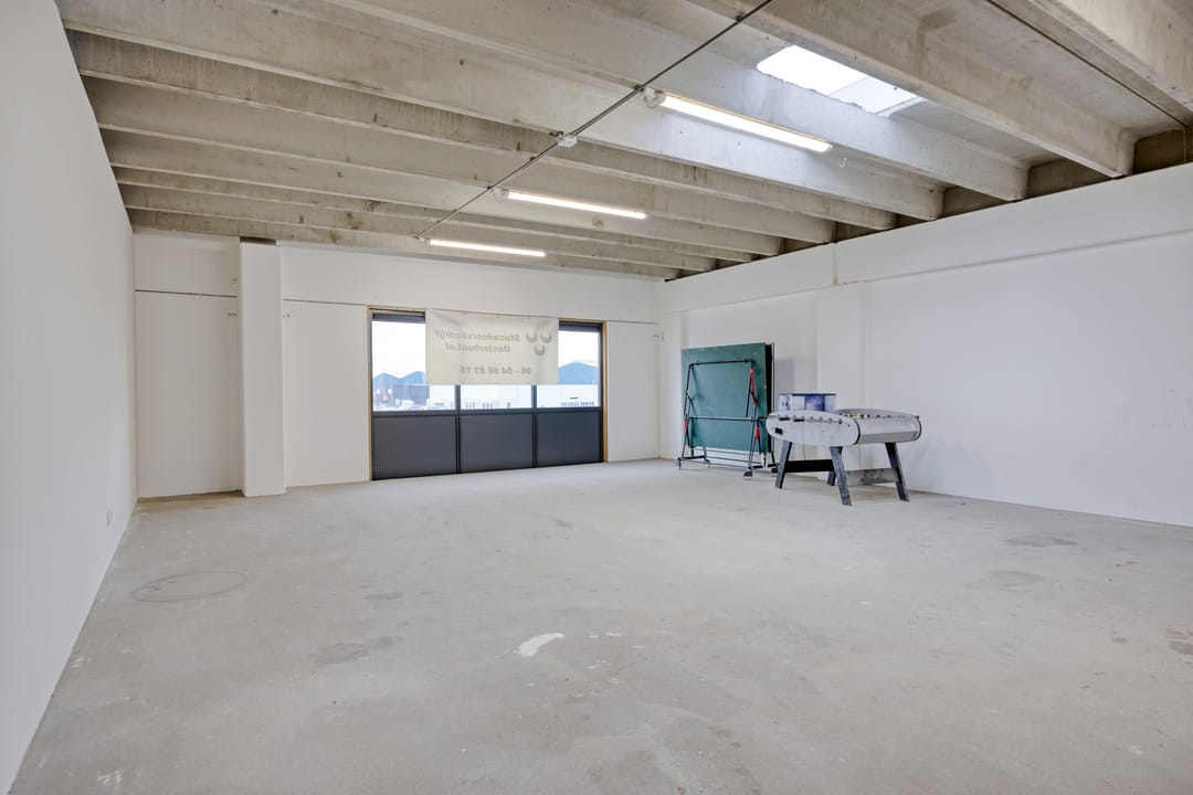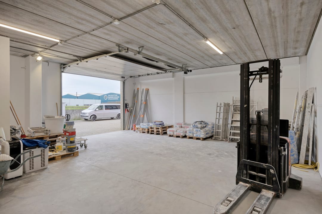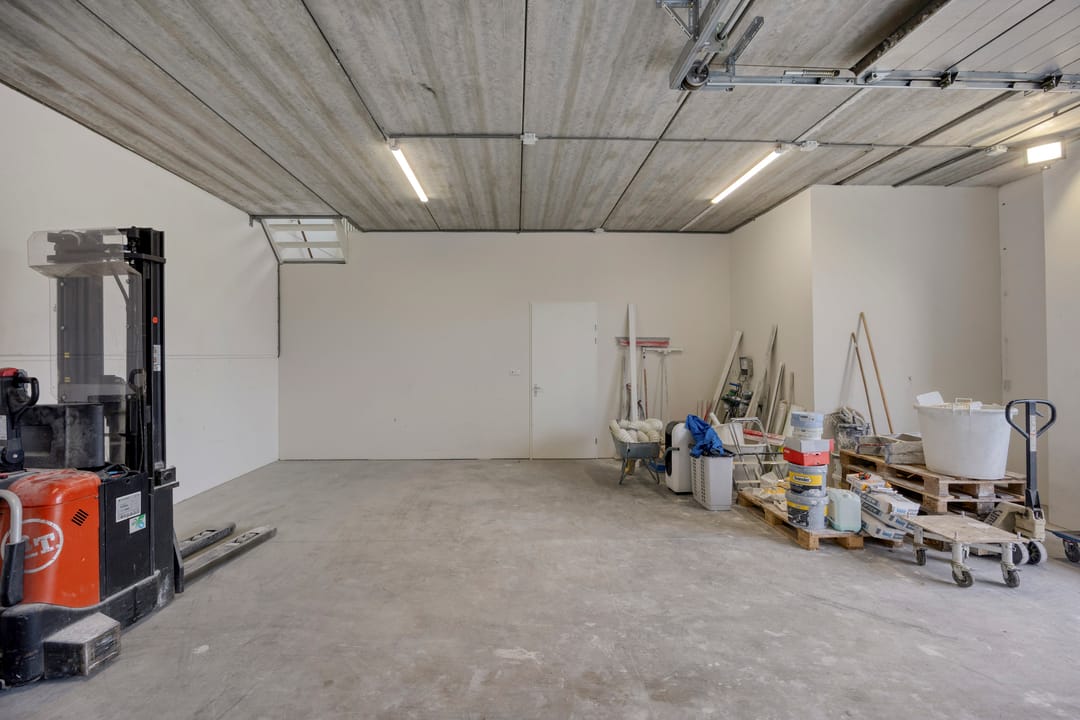 - Overheaddeuren, betonvloer, toilet, pantry en te openen ramen