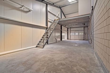 Zeer ruime bedrijfshal op de begane grond met trap naar de verdiepingsvloer. Deze verdiepingsvloer kan bijvoorbeeld gebruikt worden als kantoorruimte en beschikt over een pantry met boiler voor heet water en een toilet.