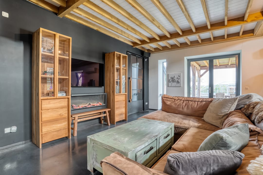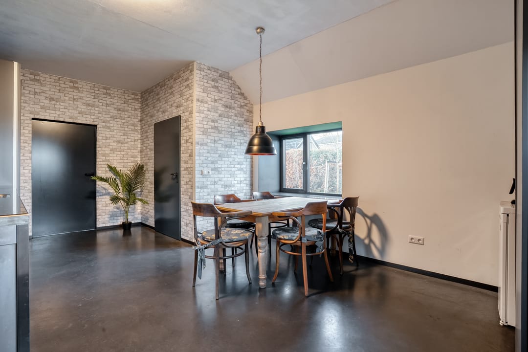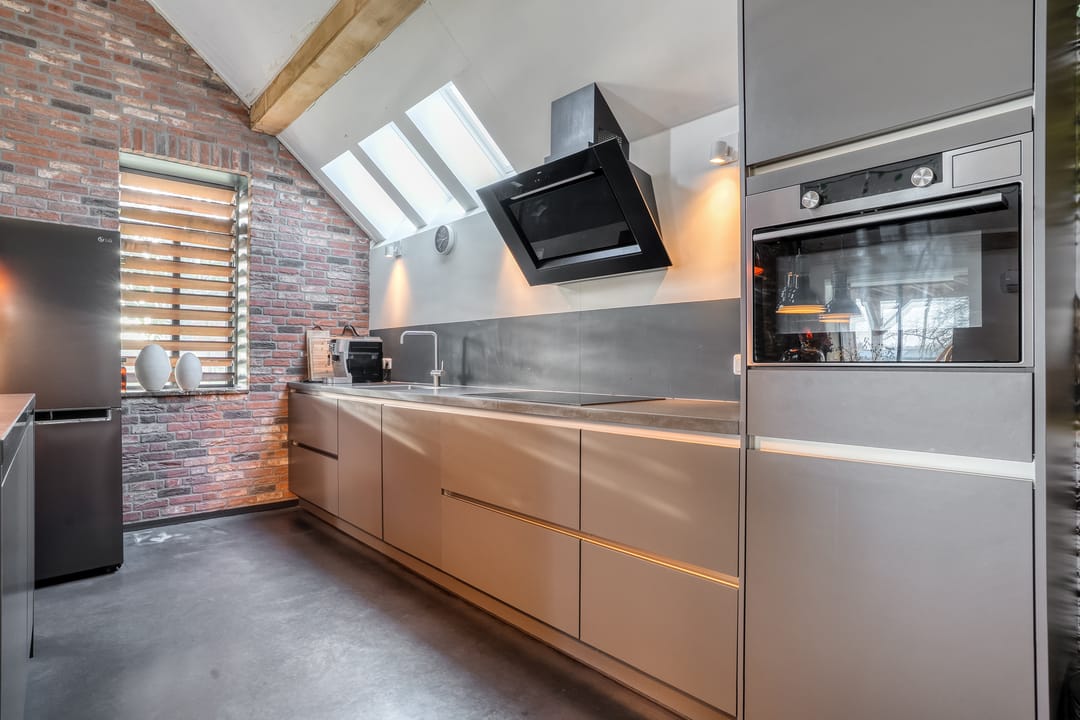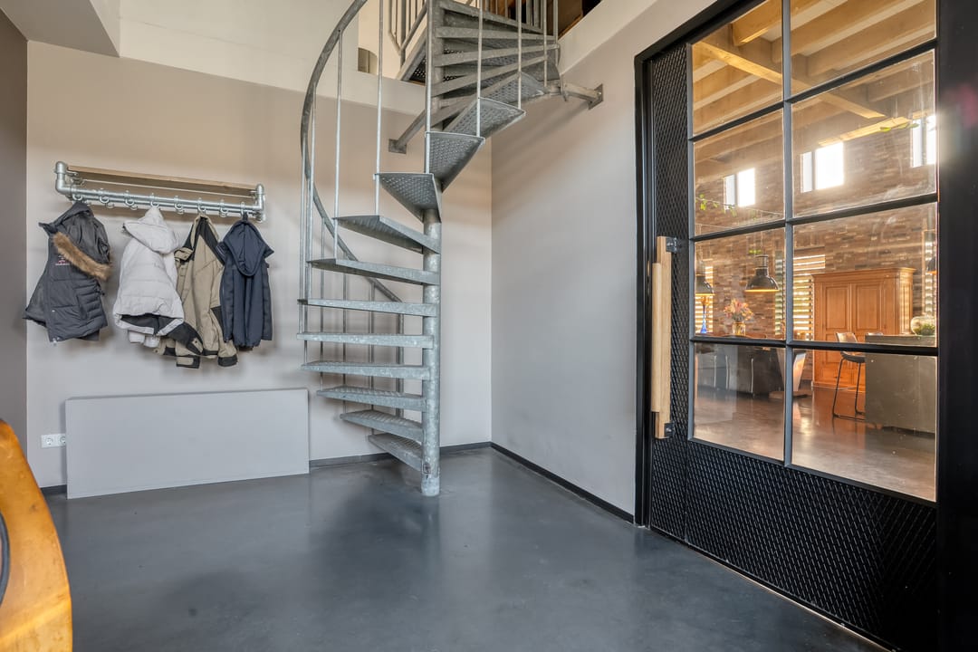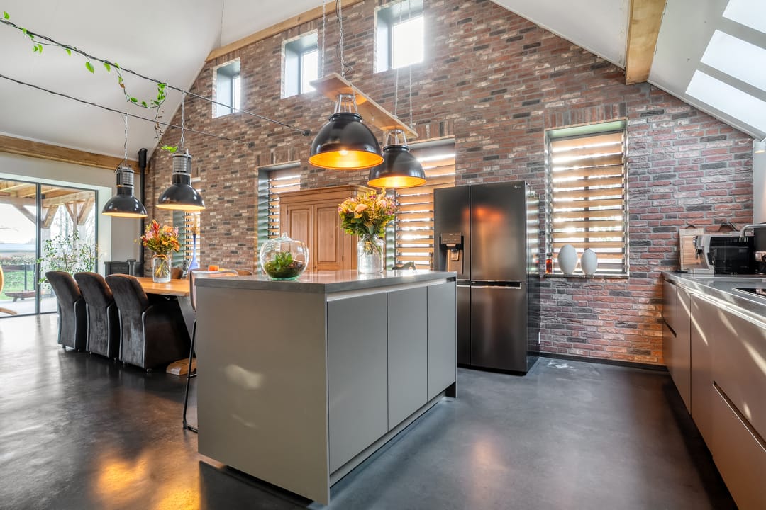 De begane grond beschikt over een entree met trapopgang, een ruime woonkamer met open keuken, voorzien van diverse inbouwapparatuur en een verrijdbare bar. De keuken vormt het hart van de woning en sluit perfect aan bij de industriële uitstraling.