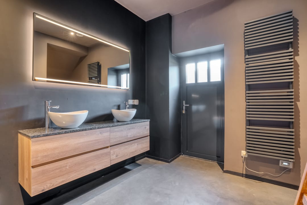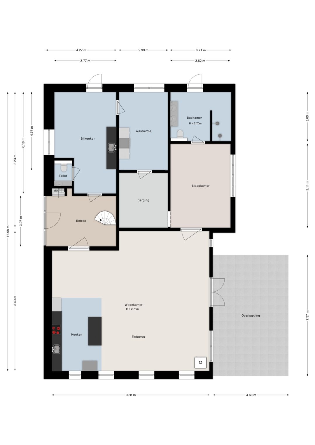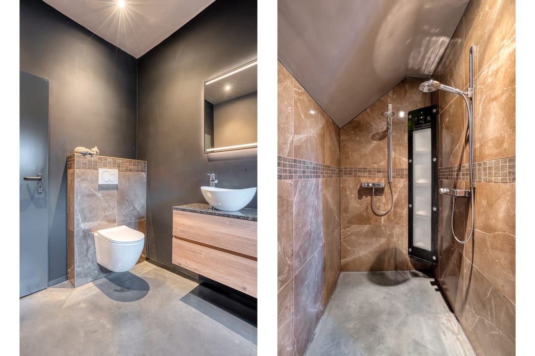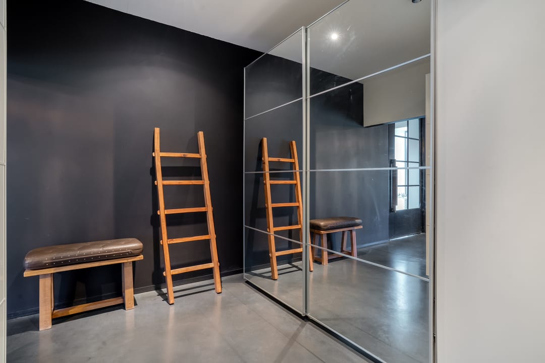 De begane grond beschikt over een entree met trapopgang, een ruime woonkamer met open keuken, voorzien van diverse inbouwapparatuur en een verrijdbare bar. De keuken vormt het hart van de woning en sluit perfect aan bij de industriële uitstraling.
