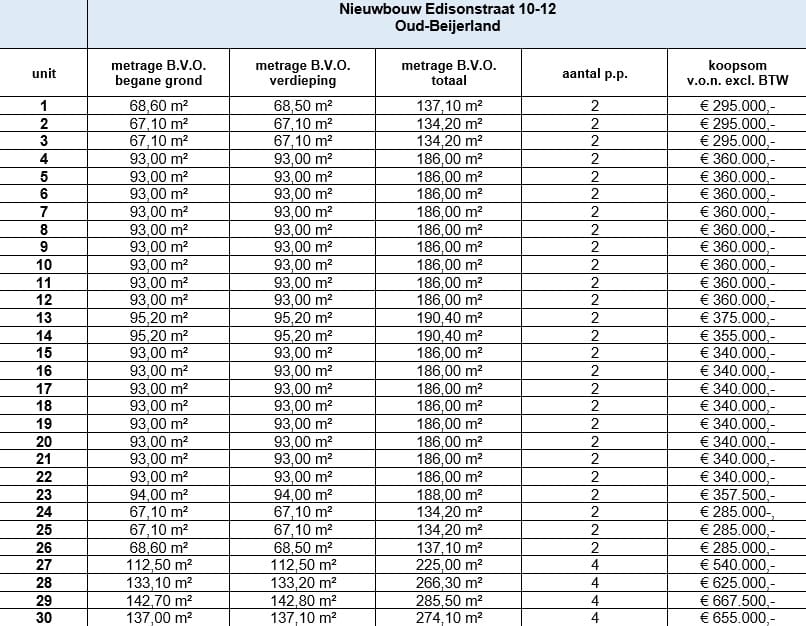 - bij notariele overdracht van het appartementsrecht betalen de kopers 40% van de totale koopsom, de overige 60% wordt betaald in bouwtermijnen.
