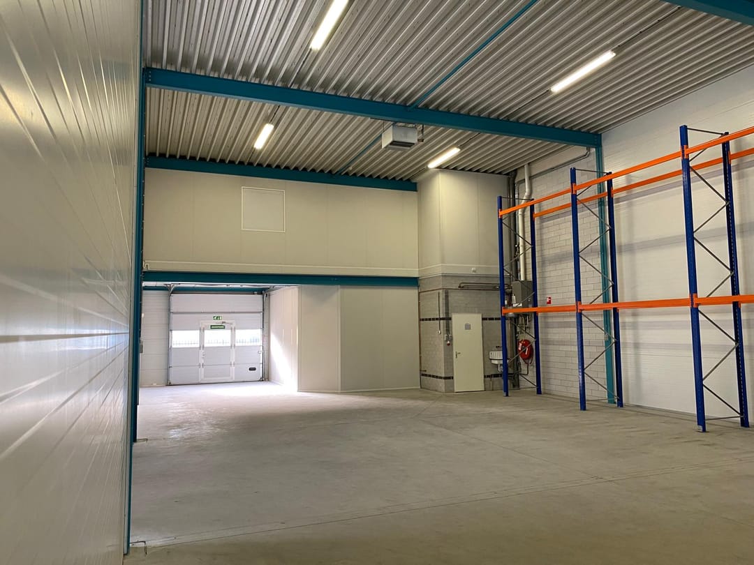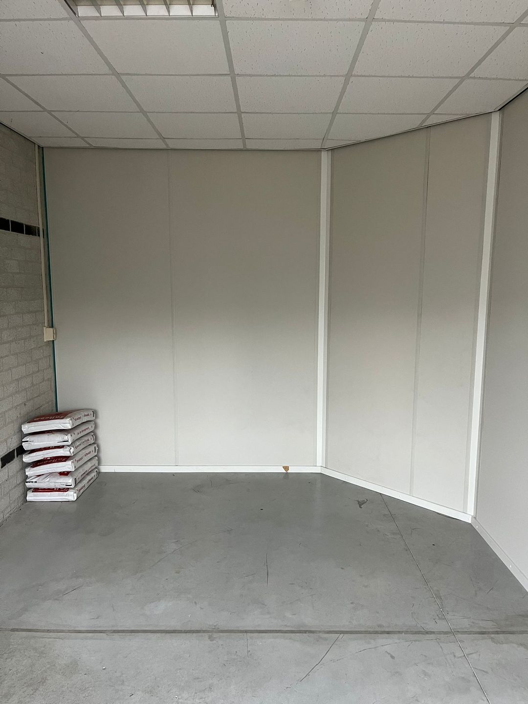 - bedrijfsruimte / magazijn, geïsoleerde systeemwanden en schoonmetselwerk, gevlinderde vloer, plafond vv. inbouwarmaturen;