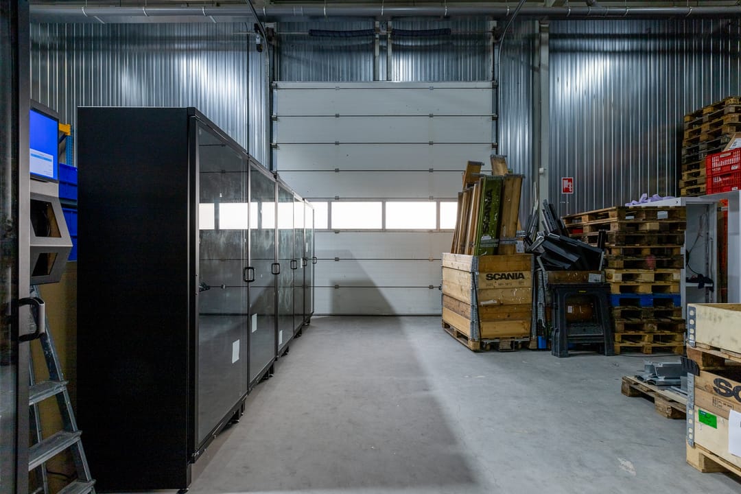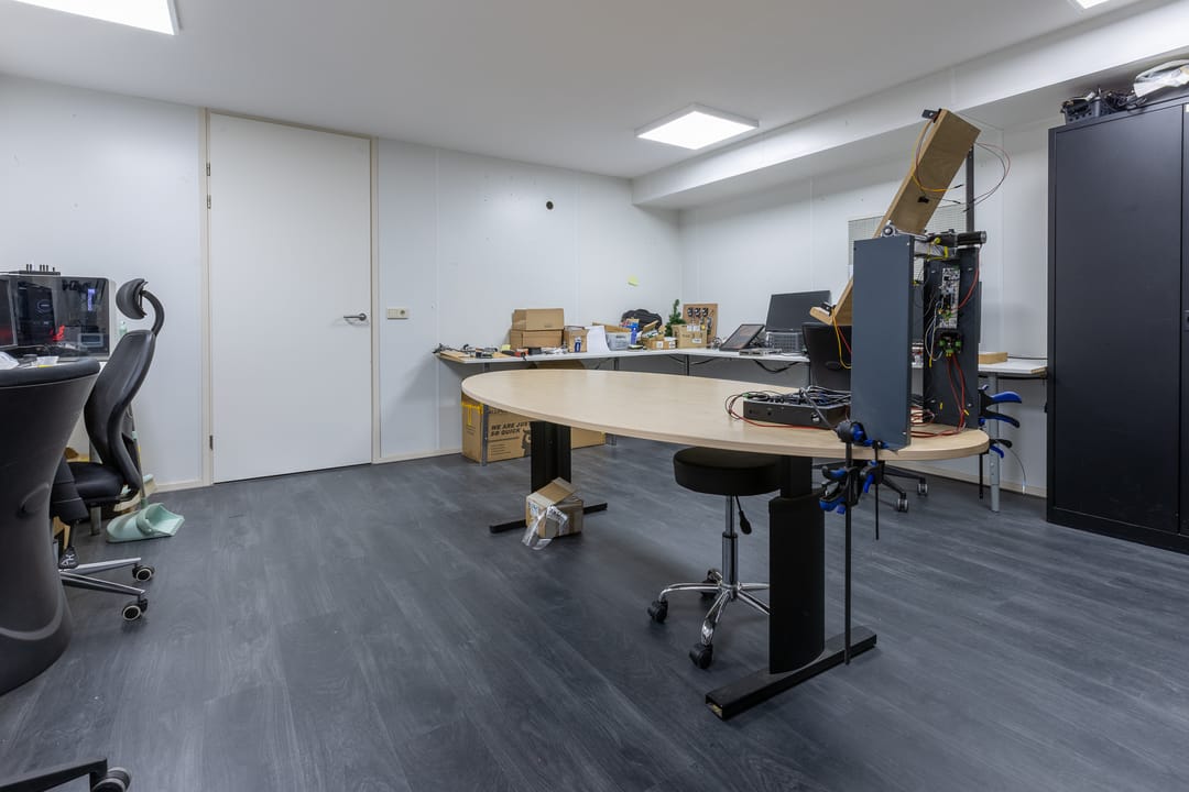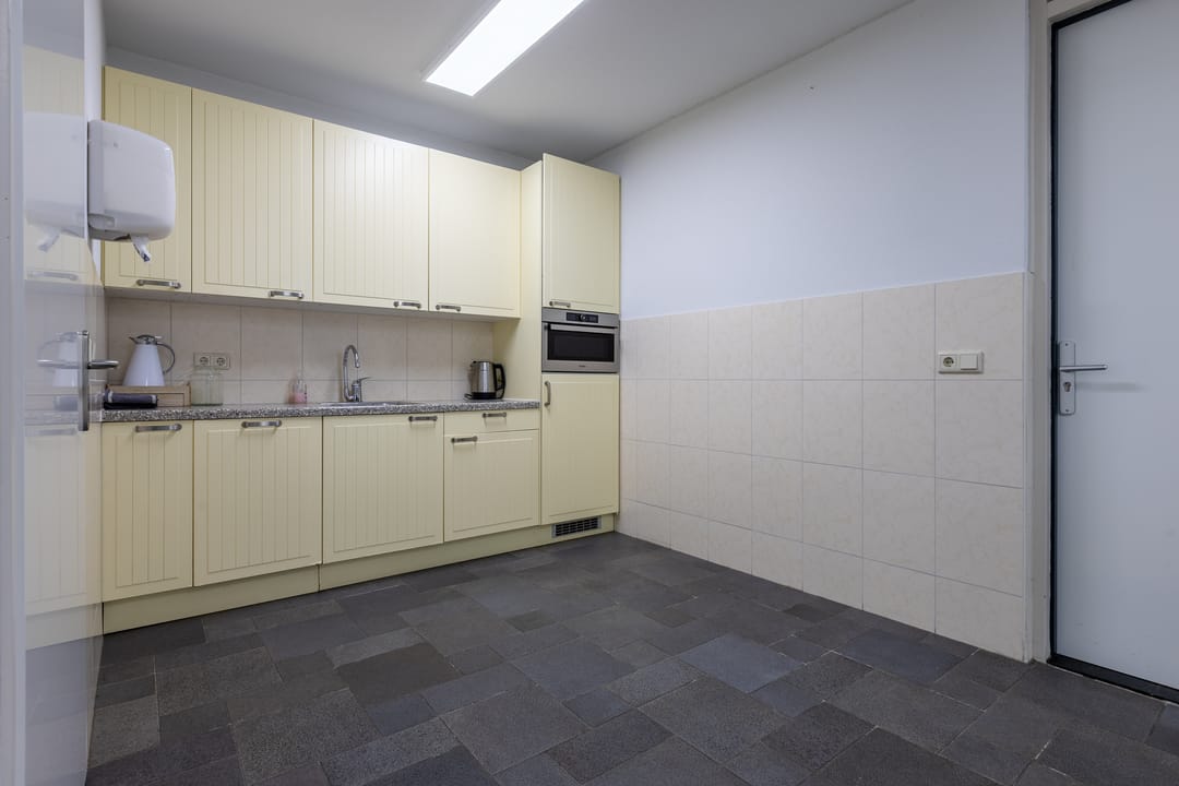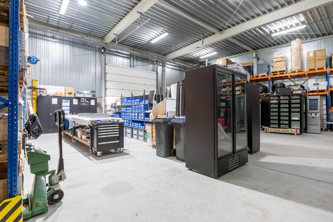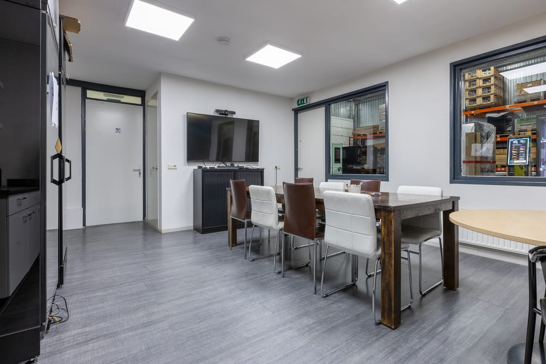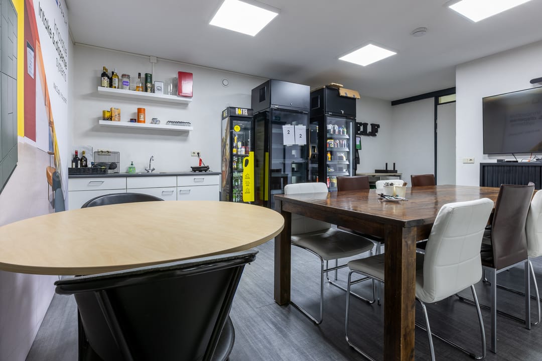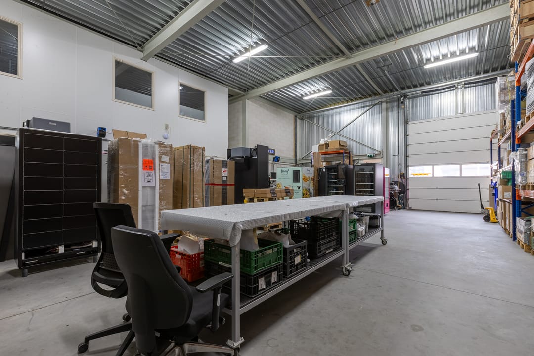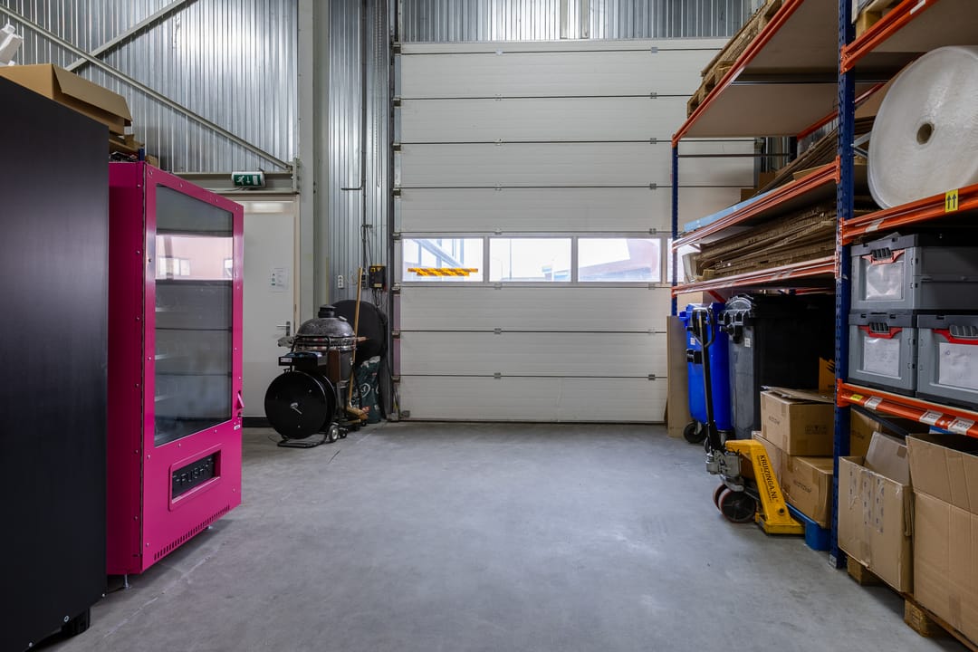 De pantry geeft toegang tot de royale bedrijfshal van bijna 400 m². De bedrijfshal is voorzien van twee elektrische overheaddeuren (circa 4,0 meter breed en 4,2 meter hoog) en is op de begane grond ingedeeld met twee extra ruimtes: een kantine en een afgesloten werkruimte.
