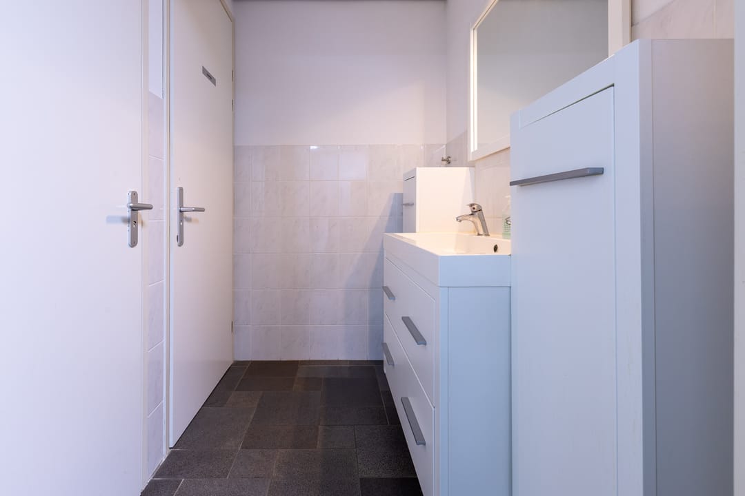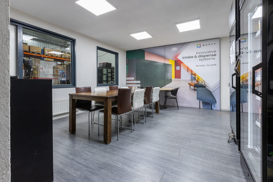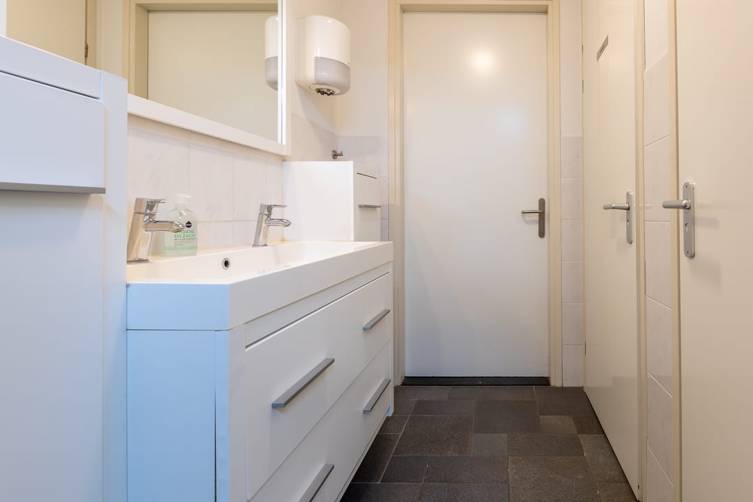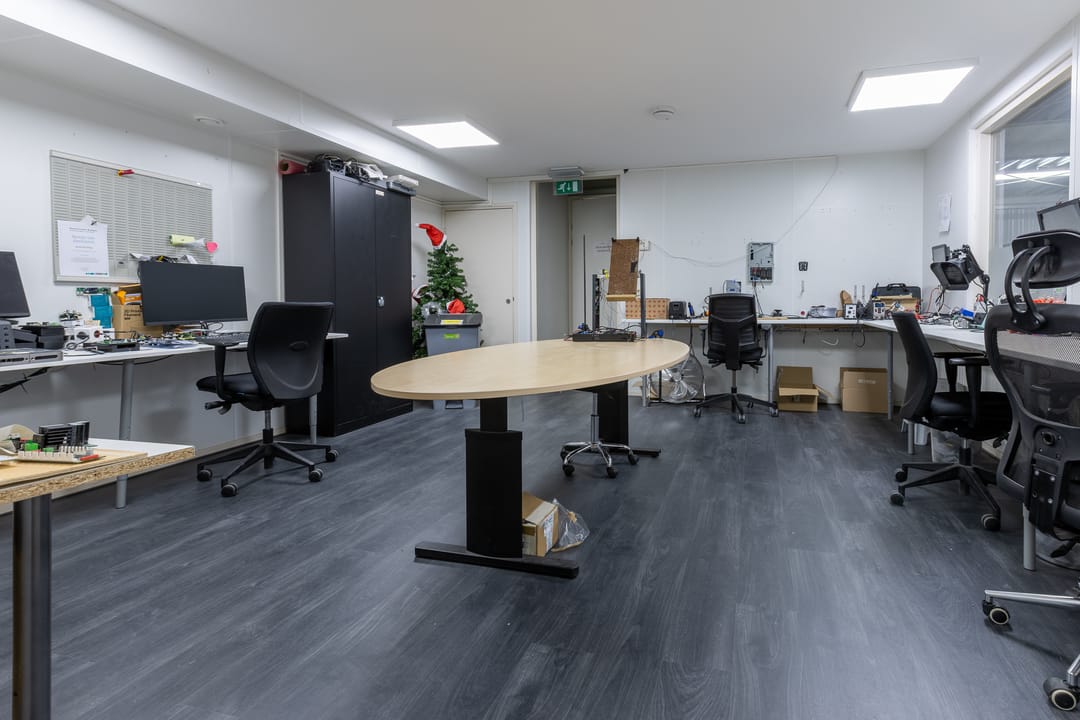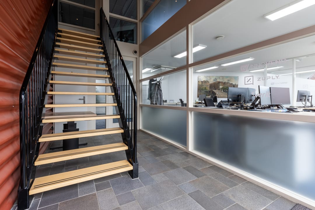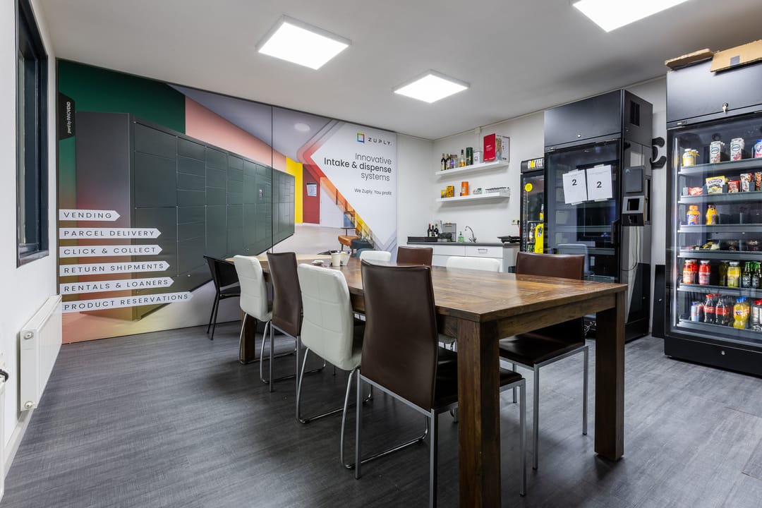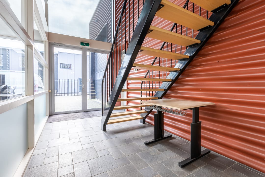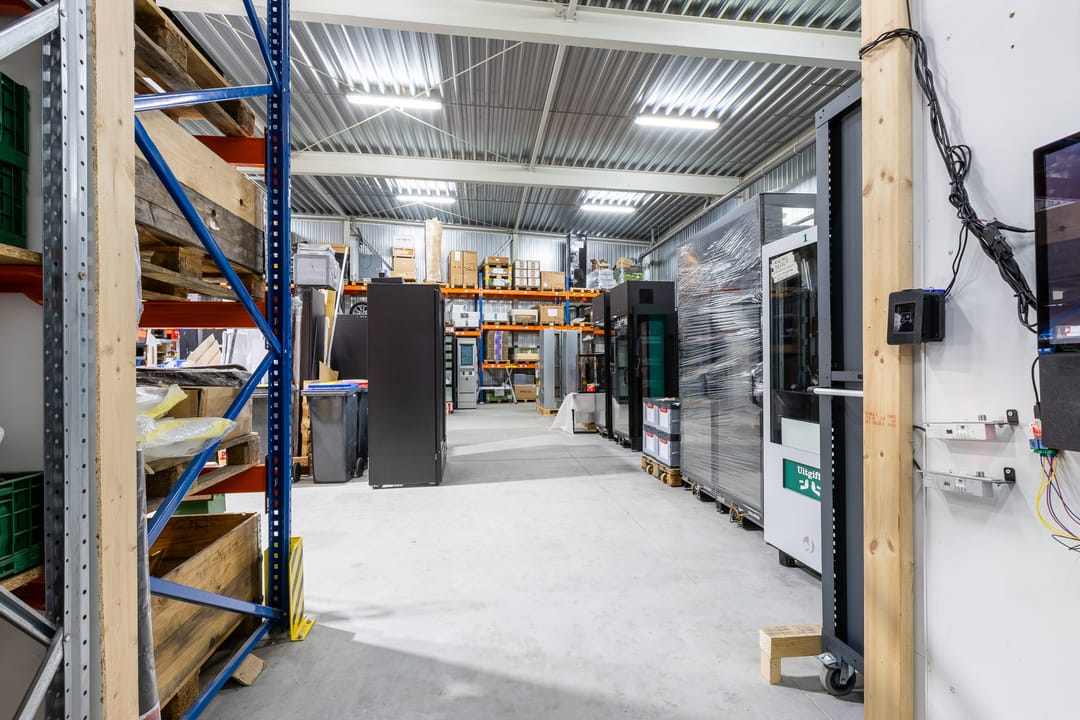 De pantry geeft toegang tot de royale bedrijfshal van bijna 400 m². De bedrijfshal is voorzien van twee elektrische overheaddeuren (circa 4,0 meter breed en 4,2 meter hoog) en is op de begane grond ingedeeld met twee extra ruimtes: een kantine en een afgesloten werkruimte.