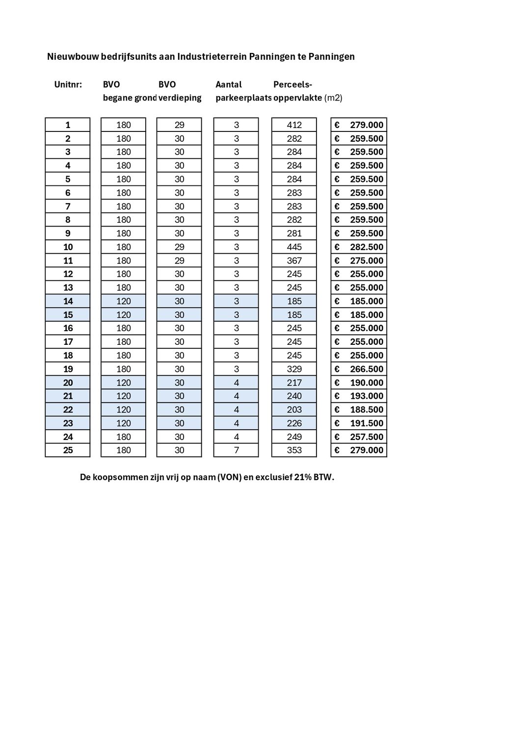 Verder zijn nog te koop unit 6-7-8-9-13-16-17-18, de overige zijn reeds verkocht. Inmiddels is de bouw gestart en staan de eerste 10 hallen al. Er wordt nu hard gewerkt aan de volgende 15. Geschatte oplevering april 2026.