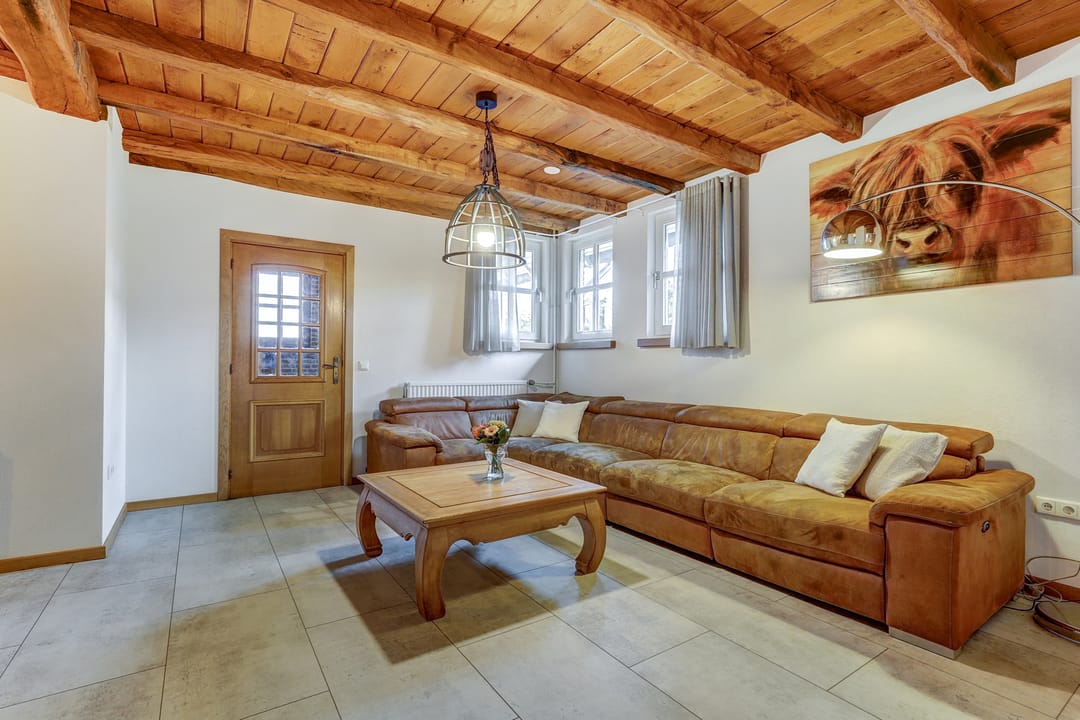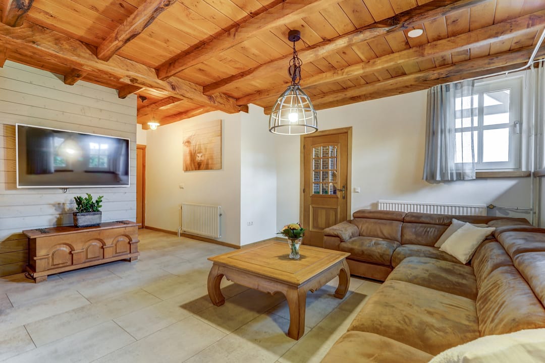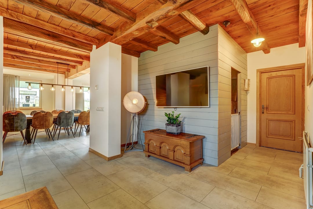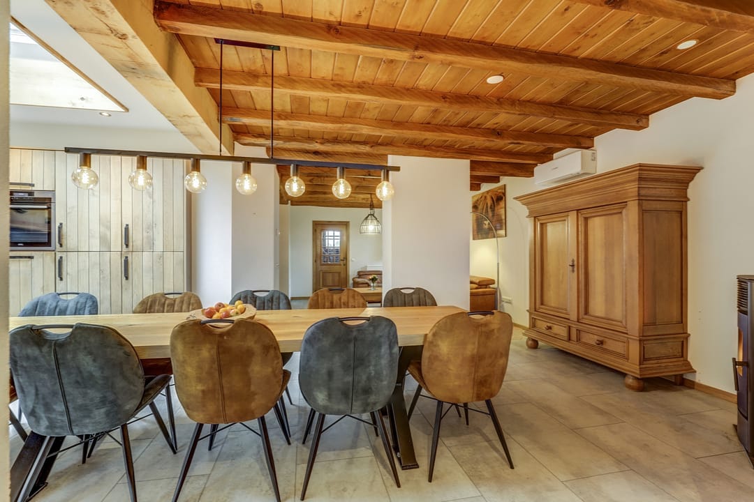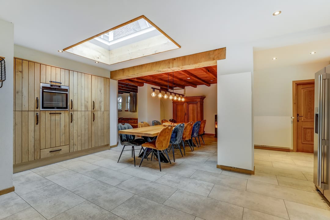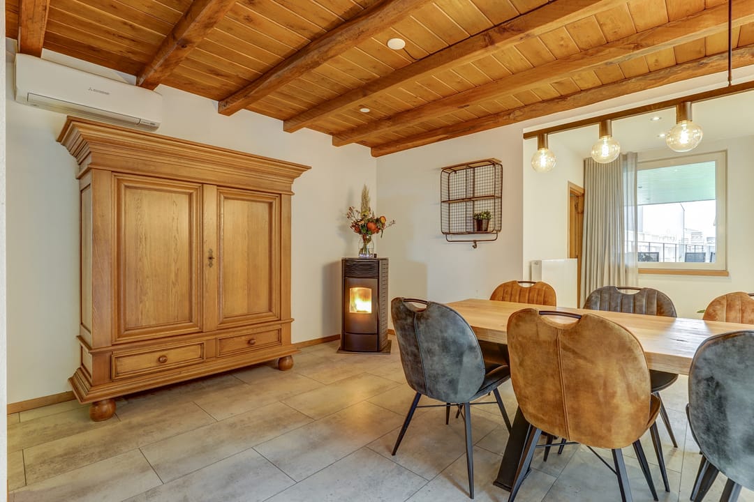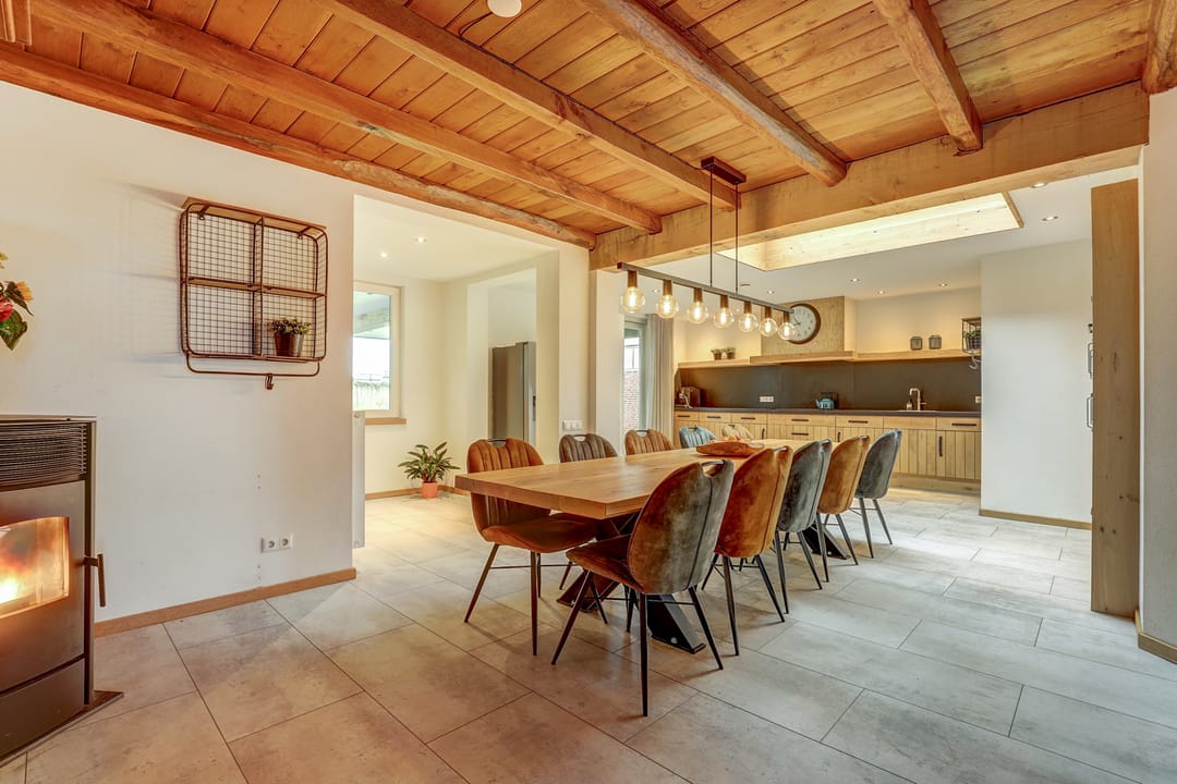 Vanuit de hal loop je links de woonkamer in die naadloos overgaat in de open leefkeuken. Terwijl je in de keuken aan het koken bent, houd je gemakkelijk contact met de mensen aan de lange eettafel of in de sfeervolle woonkamer waar het knisperen van de pellet kachel zorgt voor warmte en gezelligheid. De keuken is een echte blikvanger: uitgevoerd in massief hout, met een vijfpits inductiefornuis en afzuigkap in de schouw, een kastenwand met onder meer een oven, vaatwasser en veel bergruimte en een losstaande Amerikaanse koelkast. De pvc-vloer in lichte tint loopt door in zowel de keuken als de woonkamer en geeft samen met de strak gestucte wanden een verzorgde uitstraling. Het balkenplafond in de woonkamer creëert een huiselijke sfeer, terwijl het hogere plafond en de lichtkoepel in de keuken juist de royale ruimte benadrukken. Via een schuifpui heb je toegang tot het indrukwekkende overdekte terras in de achtertuin.