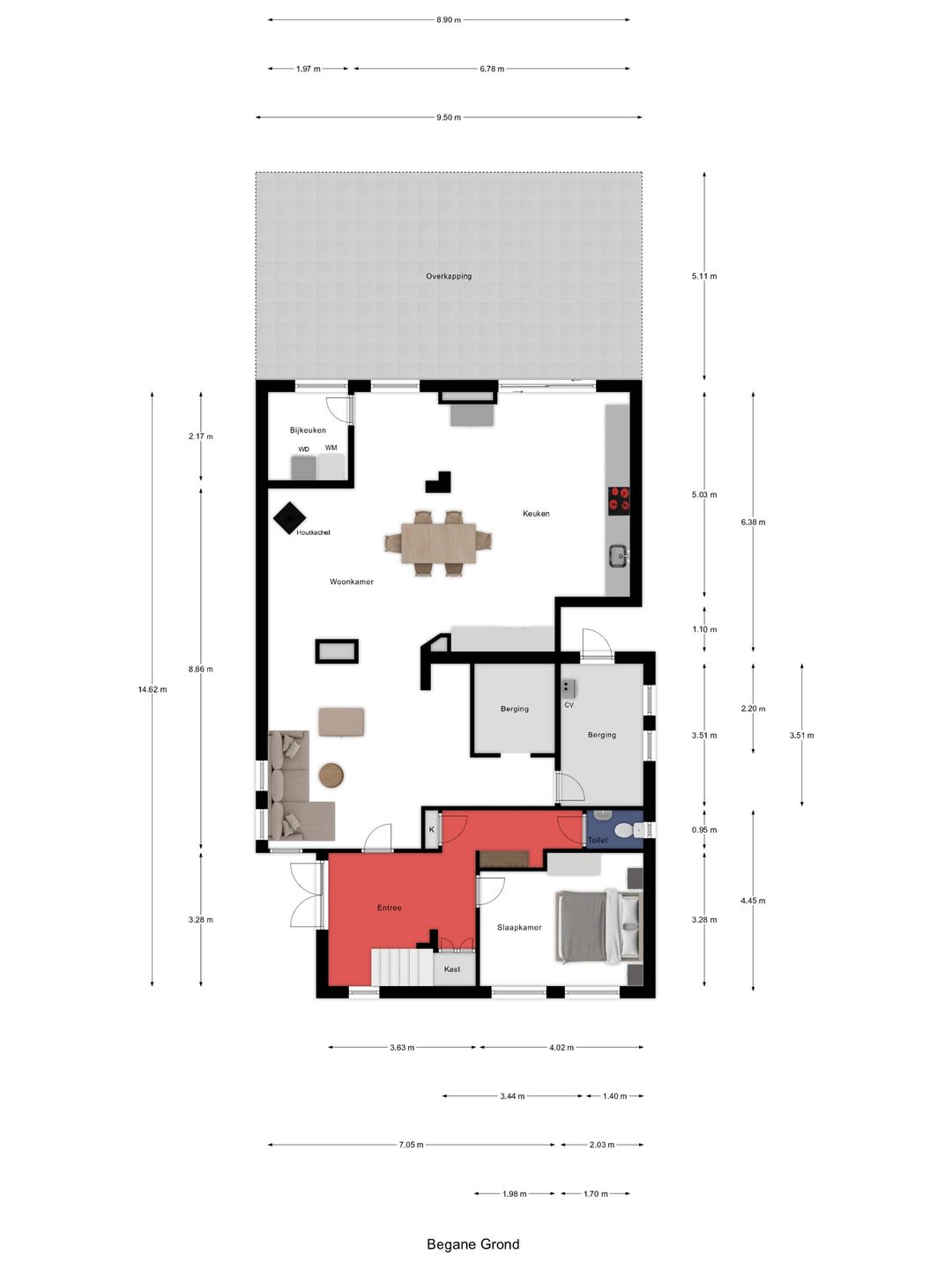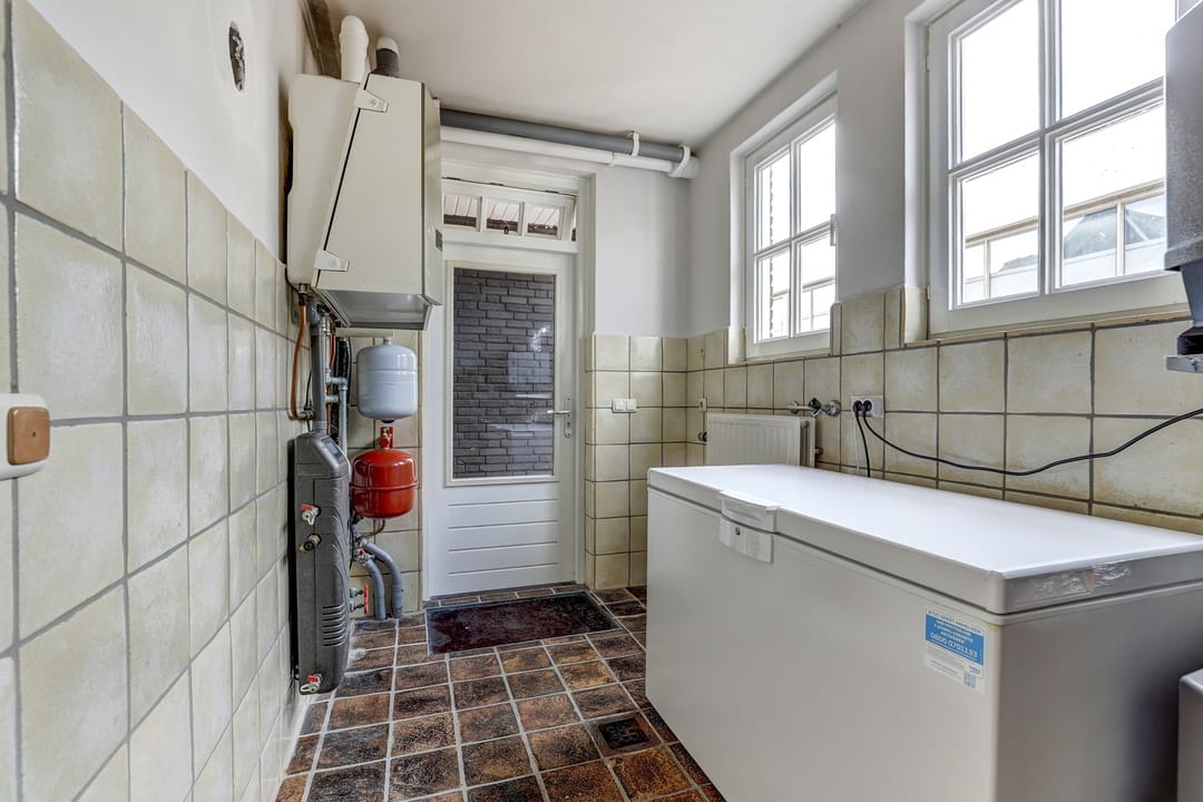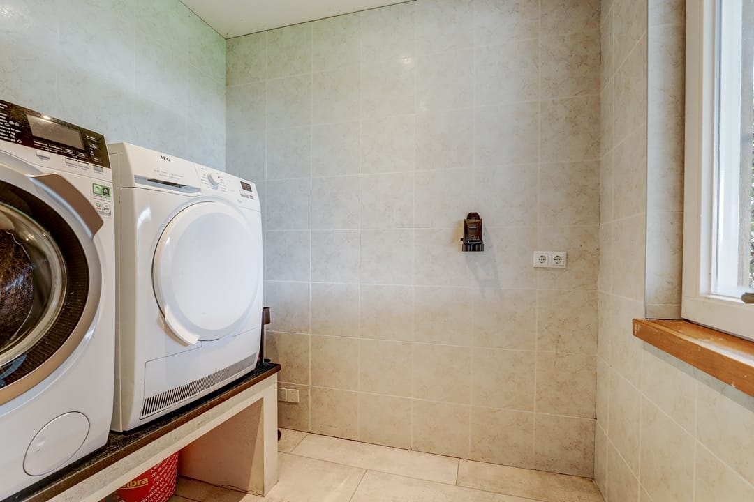 Daarnaast vind je op de begane grond een handige wasruimte met een wasmachine en droger op hoogte, zodat bukken niet meer nodig is. In de bijkeuken is plaats voor een vriezer of andere apparatuur en hier bevindt zich ook de technische installatie: twee warmtepompen en de Nefit Ecomline CV-ketel. Vanuit deze ruimte is er bovendien een deur naar de tuin, wat extra praktisch is. Als kers op de taart is er nog een aparte voorraadruimte met volop planken voor al je voorraad en hier staat ook de grote zonneboiler opgesteld.