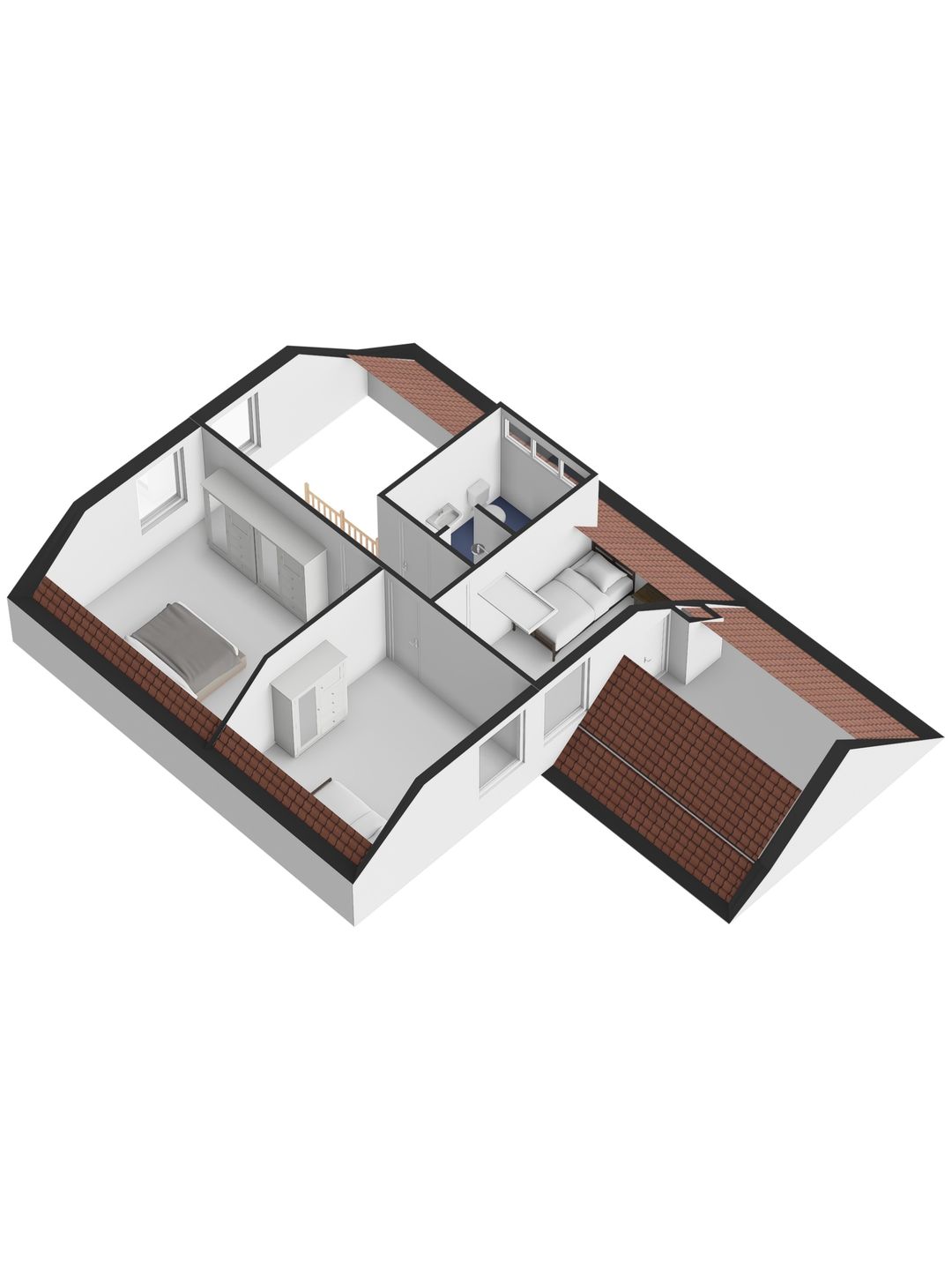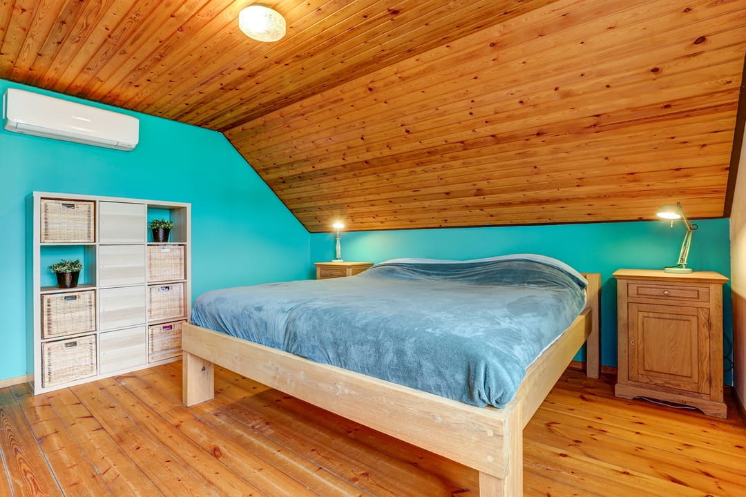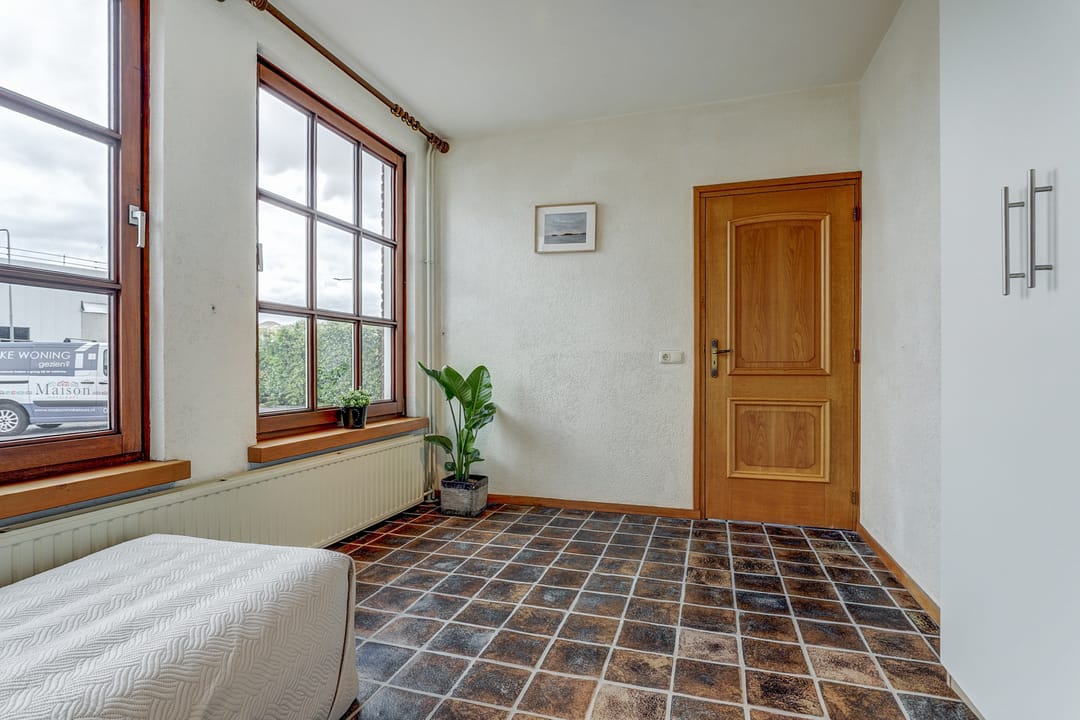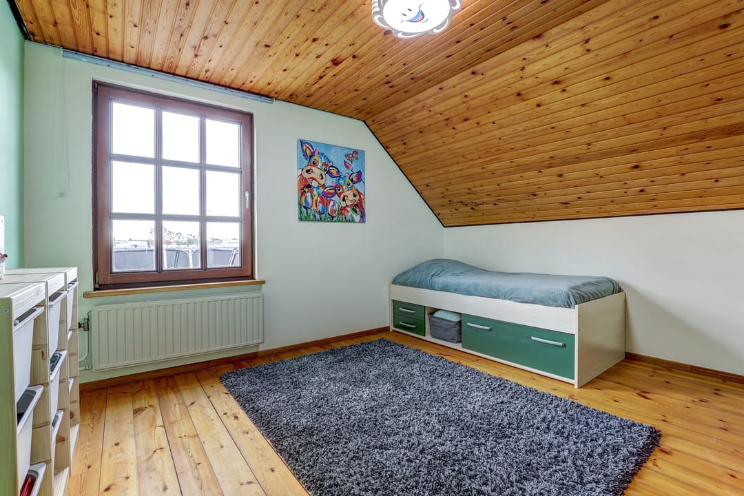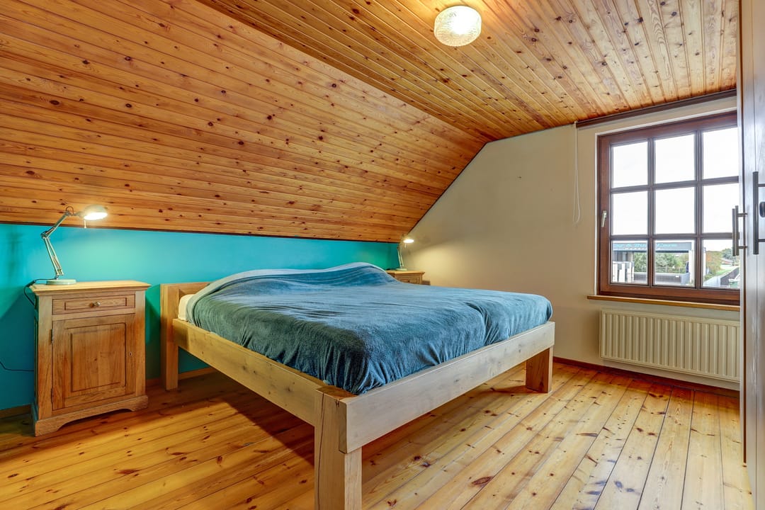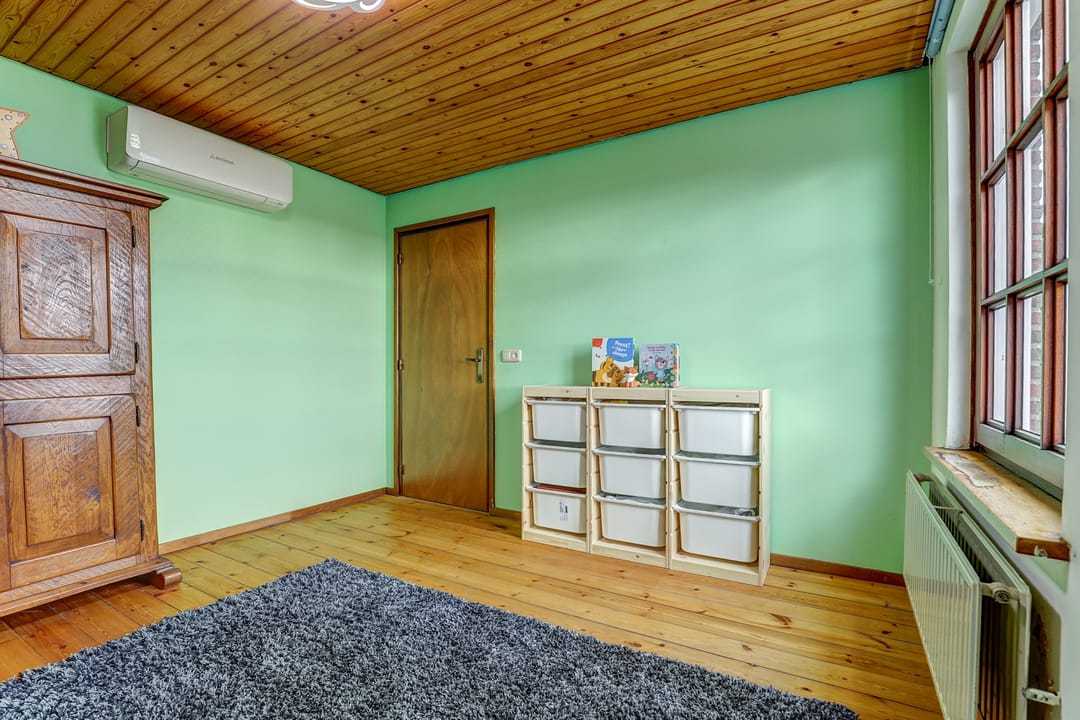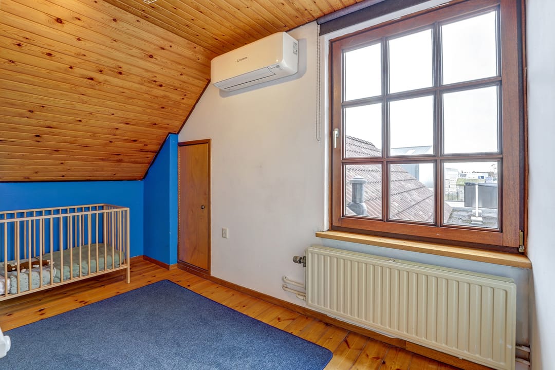 Alle drie de slaapkamers zijn uitgerust met een draaikiepraam met hor en een eigen airco die niet alleen koelt in de zomer maar ook verwarmt in de winter. Vanuit een van de kamers bereik je via een luik en vlizotrap de praktische bergzolder, terwijl een klein deurtje in de wand toegang geeft tot het zoldertje boven de wasruimte, ideaal voor extra opslag.