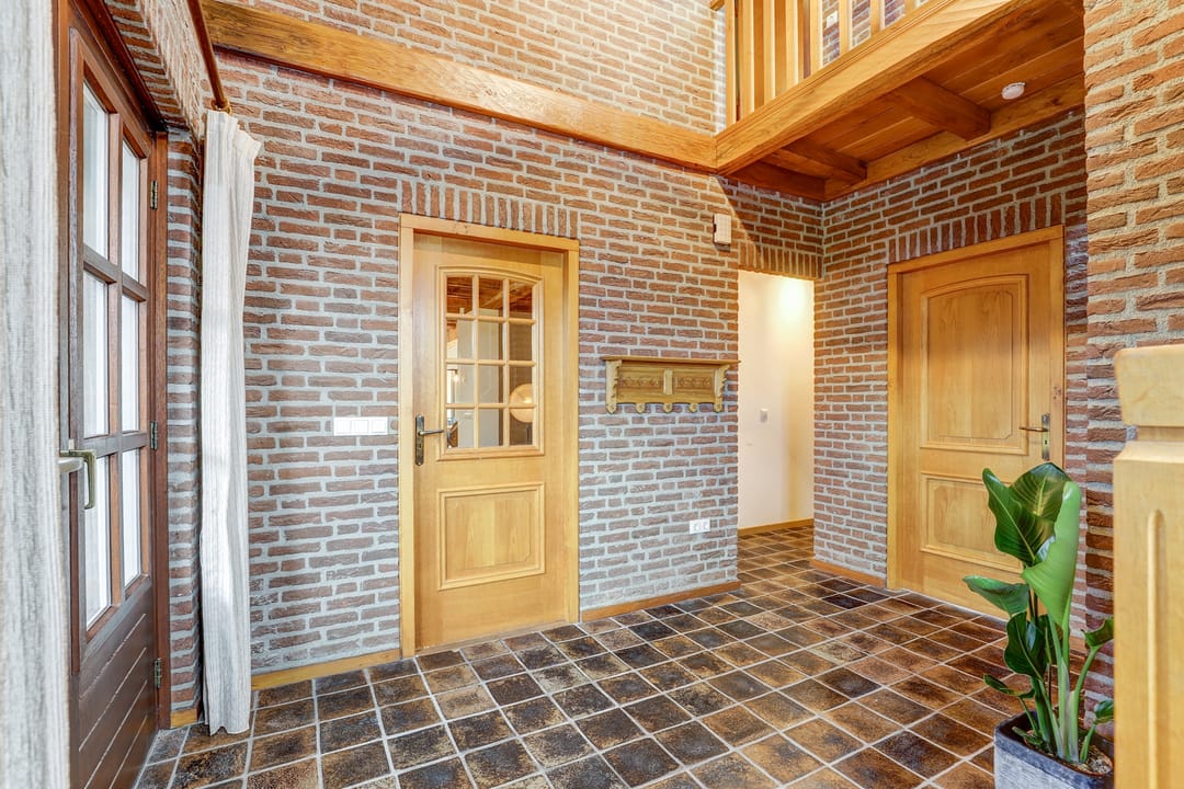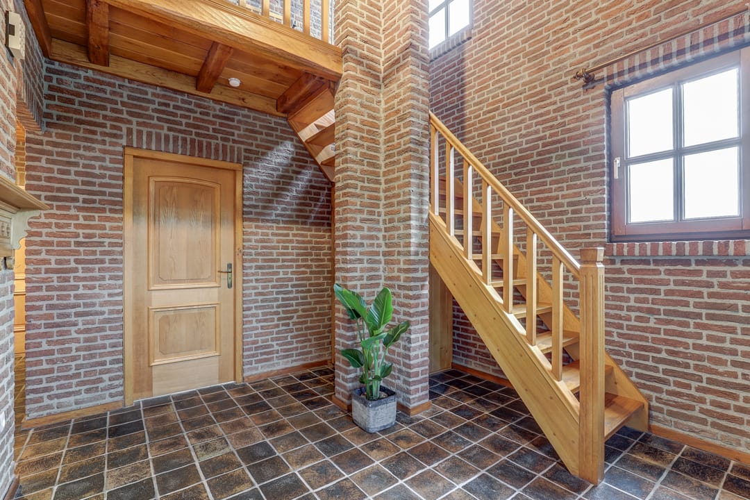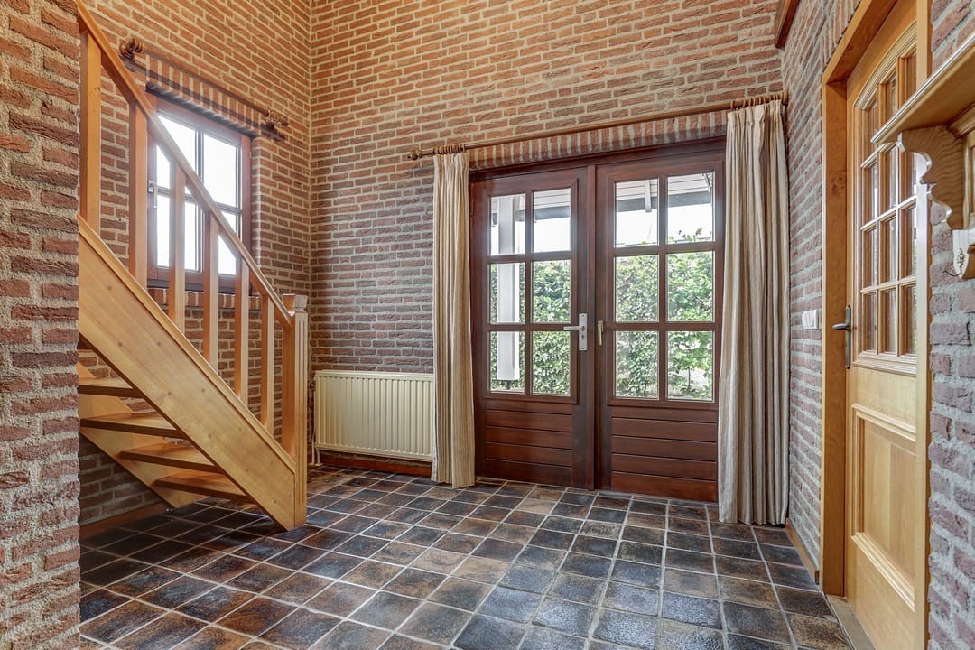 Wanneer je aankomt bij deze woning, rijd je direct het royale parkeerterrein op waar voldoende plek is voor meerdere auto’s en waar zelfs vrachtwagens gemakkelijk kunnen keren. De woning bereik je via de voordeur aan de linkerkant, maar ook via de rechterzijde kun je door de dubbele poort naar de achterdeur. Binnenkomend door de voordeur stap je in een ruime hal met daarnaast een gang met garderobe, toilet en de meterkast. Een indrukwekkende trap met balustrade leidt naar de bovenverdieping en onder de trap is nog een handige trapkast gemaakt.