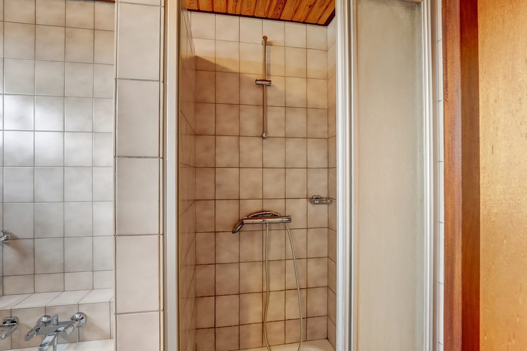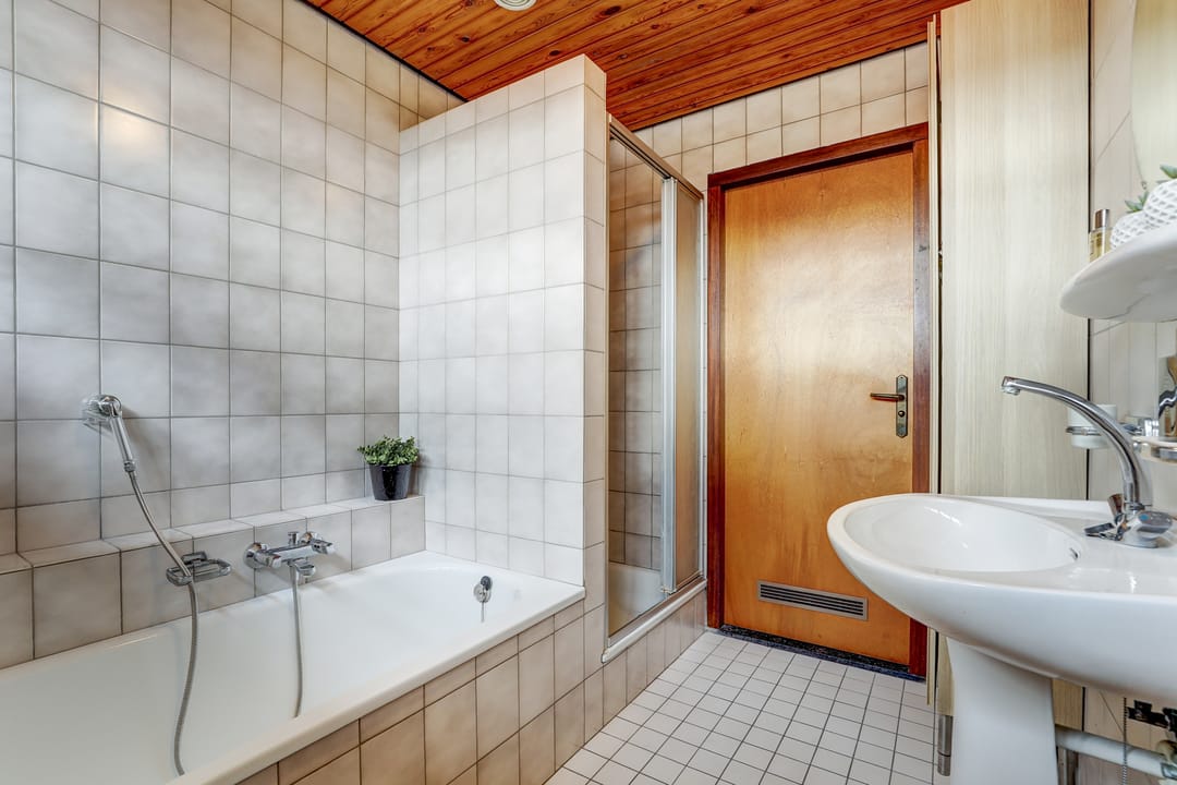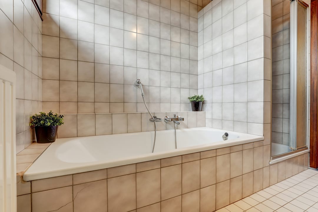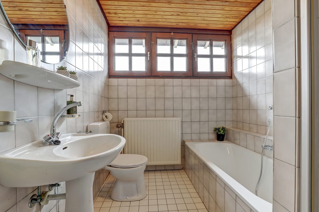 De badkamer is wat verouderd, maar nog altijd functioneel en compleet ingericht met een ligbad, een douchecabine met schuifwand, een toilet en een wastafel. Dankzij de mechanische afzuiging en drie hooggeplaatste ramen is er altijd voldoende licht en frisse lucht, zonder dat je last hebt van inkijk. De badkamer is uitgevoerd in lichte wand- en vloertegels.