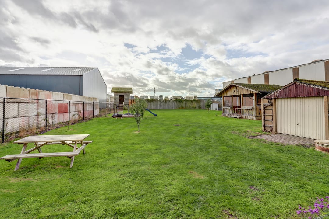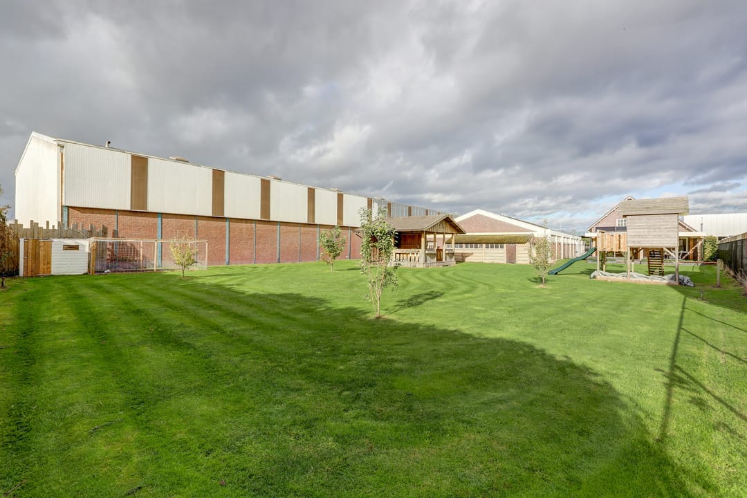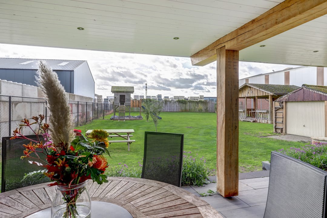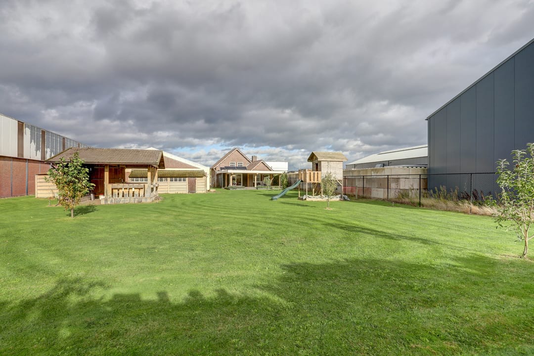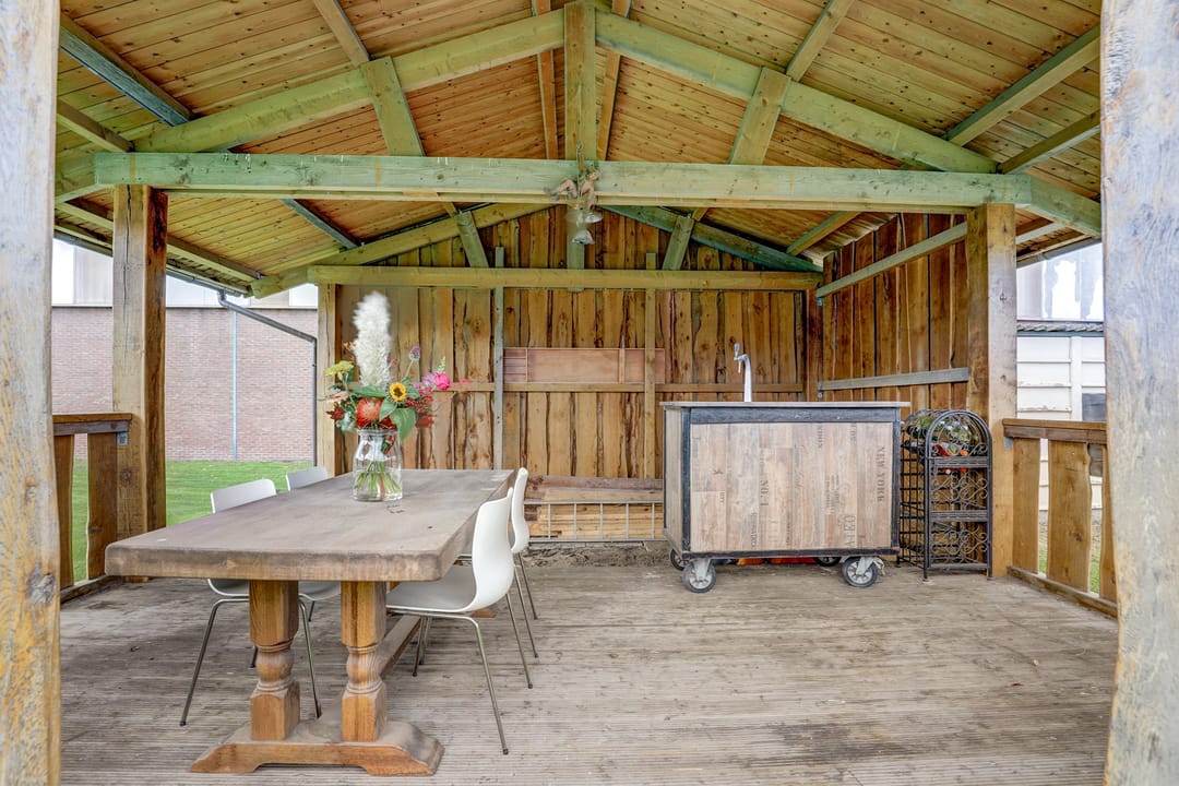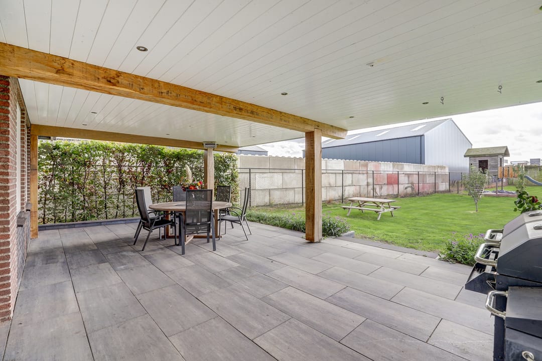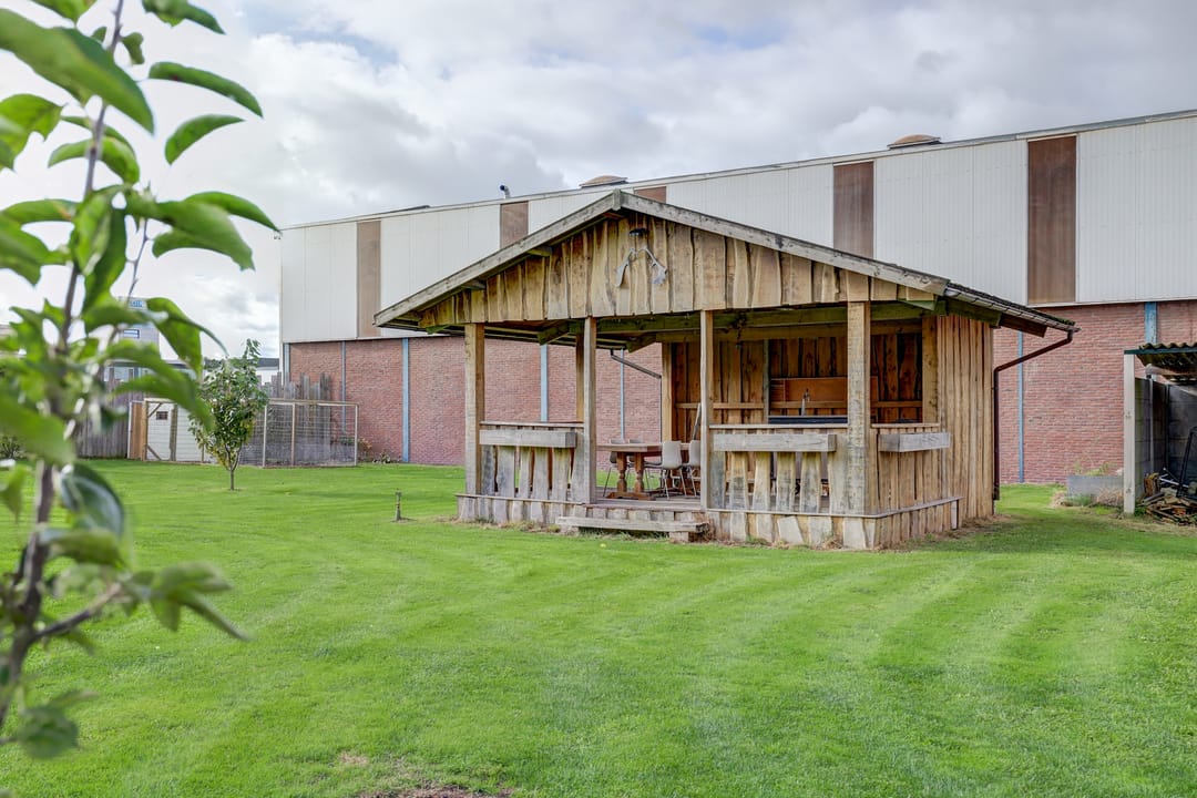 Zodra je door de schuifpui in de keuken naar buiten stapt loop je het indrukwekkend, enigszins verhoogd terras op dat overdekt is met behulp van robuuste balken. Hier creëer je moeiteloos je eigen buitenwoonkamer, met plek voor een lange eettafel, een gezellige loungehoek en zelfs een complete buitenkeuken of barbecue. Vanaf dit terras kijk je uit over de enorme tuin van maar liefst zo’n 40 meter diep, een zee van ruimte die vooral bestaat uit een groot grasveld met zes fruitbomen (appel, peer en kers). Midden in de tuin staat een sfeervolle houten “hut” compleet met veranda, biertap en genoeg zitplaatsen, dé plek om heerlijke feestjes te geven. Achter de hut is zelfs nog een extra overdekte ruimte waar je een tractor, caravan of ander groot materieel droog kunt stallen. Daarnaast vind je in de tuin twee handige bergingen en een garage met kantelpoort, groot genoeg voor een aanhanger en ingericht met een eigen werkplaats. Helemaal achterin de tuin ligt een kippenhok met buitenverblijf, zodat je zelfs je eigen verse eieren kunt rapen. Dankzij de eigen put met waterpomp en sproei-installatie houd je de tuin gemakkelijk groen en fris, zelfs in een hete zomer. De tuin is volledig omheind en via de dubbele poort rij je eenvoudig met auto, aanhanger of tractor achterom.