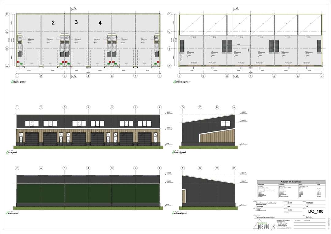 - betonnen gevelplint met daarboven sandwichbeplating, voorgevel antraciet en ephyra metallic, achtergevel antraciet en groenkleurig;
