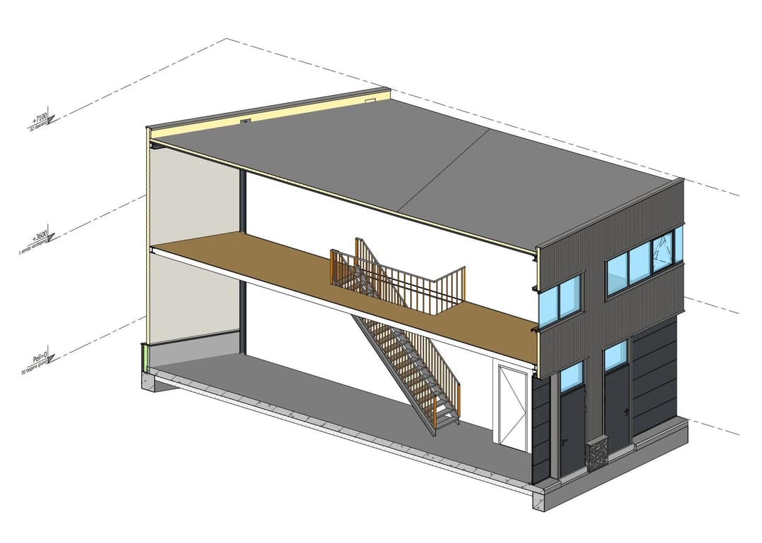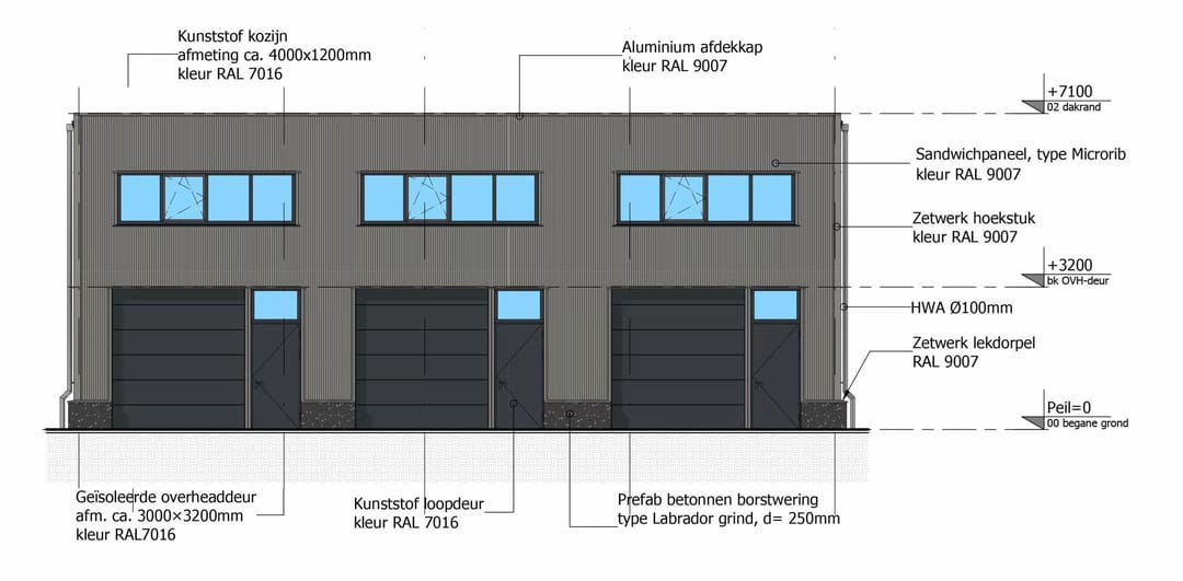 Elke unit heeft een gevelbreedte van 5 meter. De overheaddeur (3 meter breed, 3,2 meter doorrijhoogte) en de separate loopdeur zorgen voor optimaal gebruiksgemak. Optioneel kan een verdiepingsvloer van hout of kanaalplaat worden toegevoegd. Bekijk de brochure voor alle meerwerkmogelijkheden en prijzen.