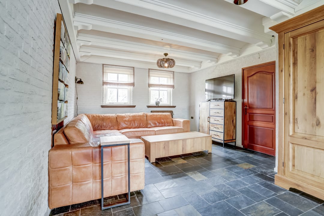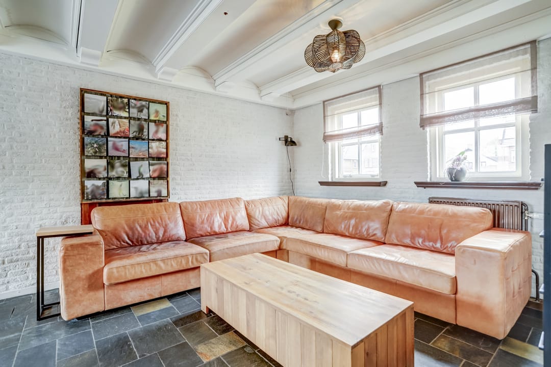 Daarnaast is de woonkamer voorzien van een tegelvloer en schoonmetselwerk wanden.