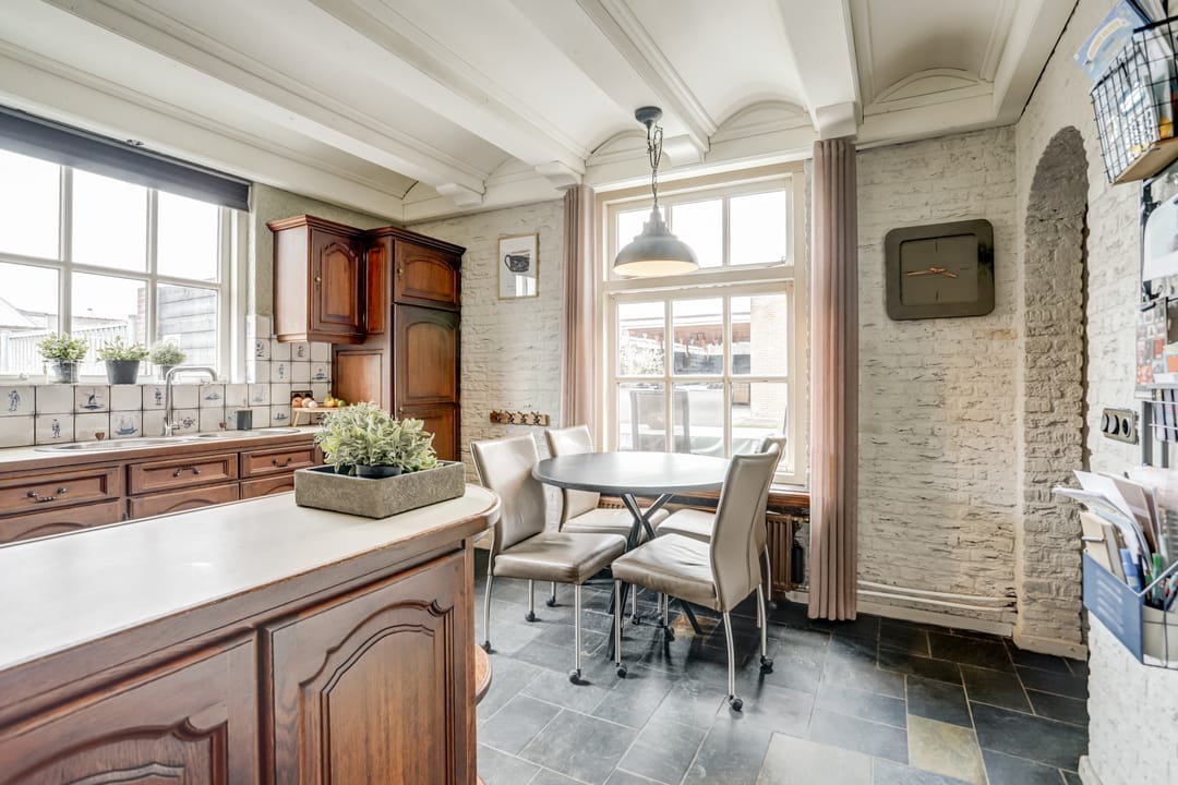 De keuken beschikt nog over mooie delfts blauwe tegeltjes tegen de wand, wat echt van die tijd was. Daarnaast beschikt het over een 4-pits gaskookstel, oven, afzuigkap, dubbele spoelbak met mengkraan en een koelkast. Ook is de keuken ruim genoeg om hier nog een aparte eettafel te plaatsen.