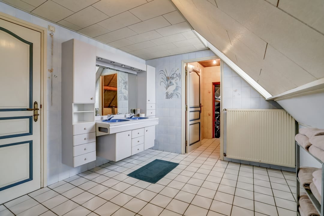 Deze royale badkamer beschikt over de juiste ruimte en indeling om hier iets moois van te maken. De badkamer beschikt over een groot badmeubel met dubbele wasbak, een douche, ligbad en voldoende opbergruimte.