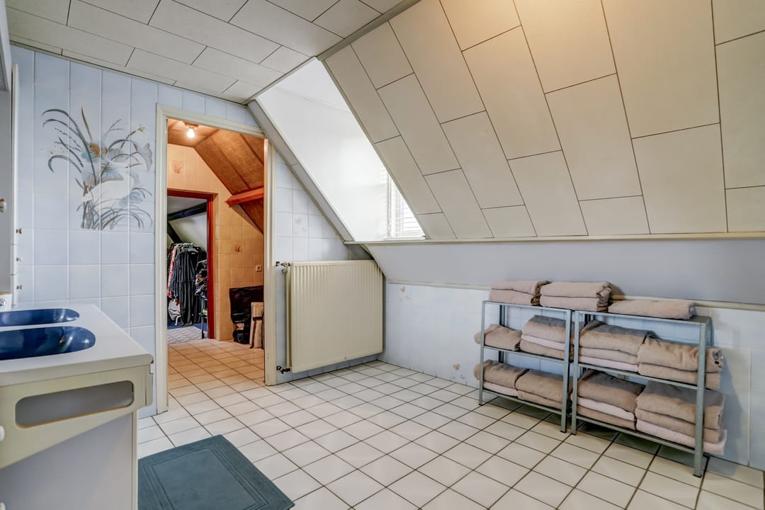 Naast de keuken bevindt zich de bijkeuken welke voorzien is van witgoed aansluitingen, uitstortgootsteen en een handige inbouwkast om al jouw spullen netjes in op te bergen. Vanuit de bijkeuken bereik je het volledig betegeld toilet voorzien van closet en een fonteintje.